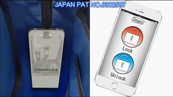 ファスナーを閉じた際、ファスナーのスライダー裏面に取り付けられたバックピットがJスマートロック内に挿入され、リモコン又はスマホアプリの操作でバックピット(=ファスナー)をロックする構造です。