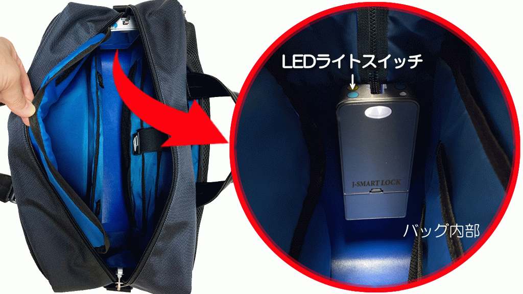 JスマートロックのLEDスイッチを押すとバッグ内を明るく照らします。