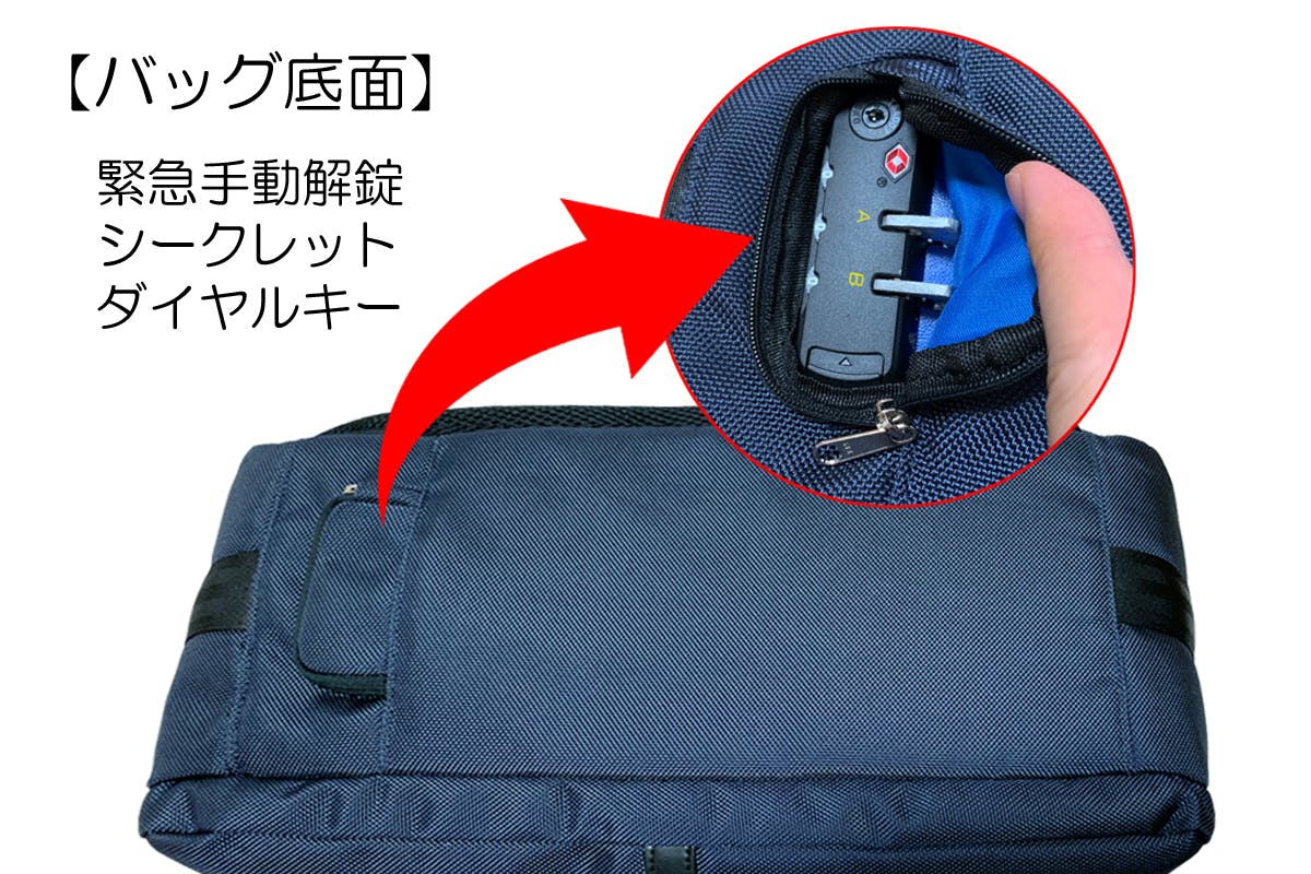 万一の非常時には、バッグ底面のシークレットポケットを開けると手動で解錠できる仕組みにしています。ダイヤルキーはご自身が決めた暗証番号を設定すれば第三者は解錠できず安心です。
