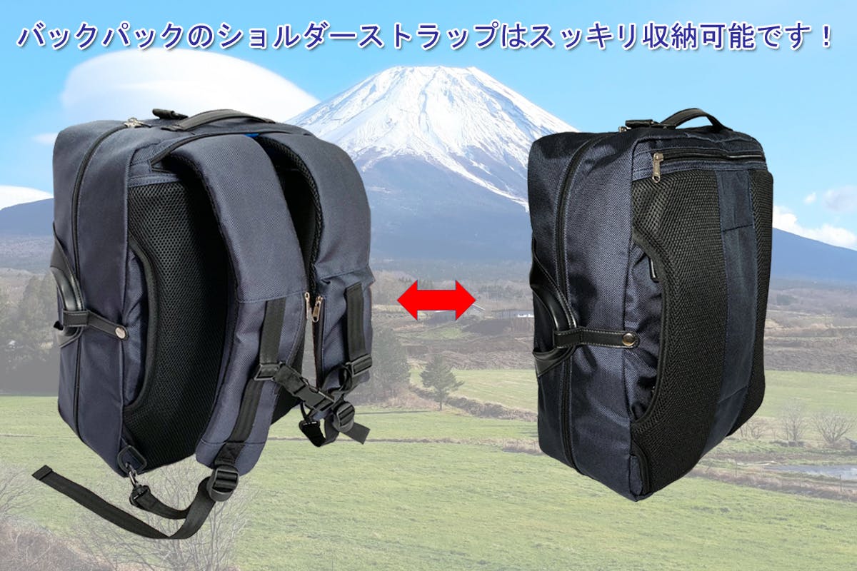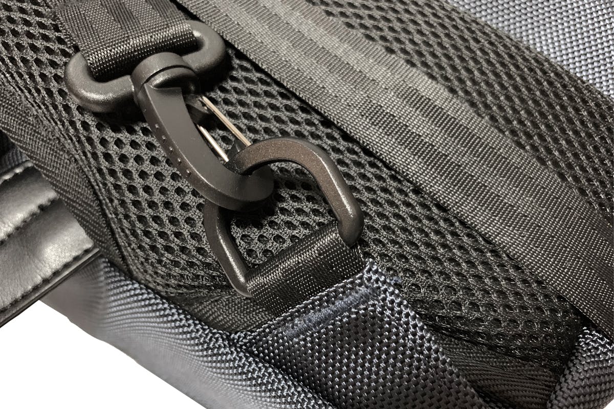 バックパックでご使用の際、手提げハンドルはこのようにクロスさせてホックで固定する仕様です。