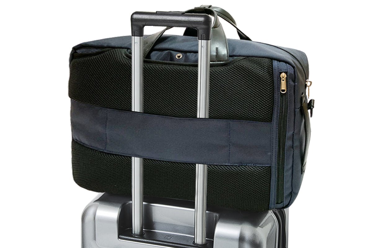後面にはスーツケースハンドルへ簡単に取り付けのできるスーツケース固定ベルトを装備。