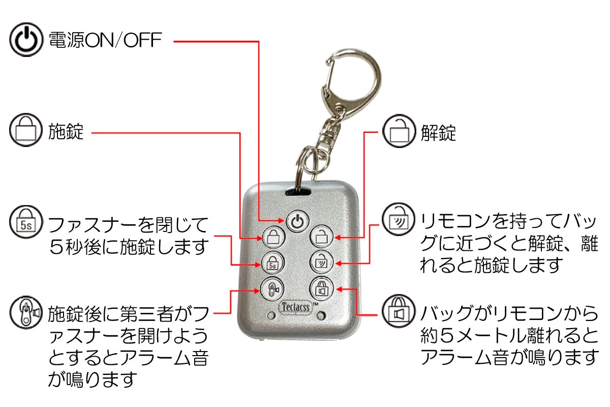 バッグの置き場所がすぐに見つからない場合、専用リモコンのファスナーマークボタンを3秒以上長押しすると通信範囲(約10m)以内にあるバッグからアラームが鳴りバッグの保管場所がすぐに見つかります。