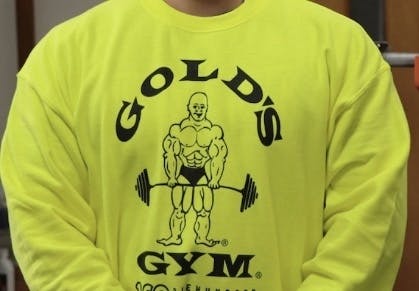 他のジムのトレーナーを着て笑顔で写真撮られているところが見所です。
