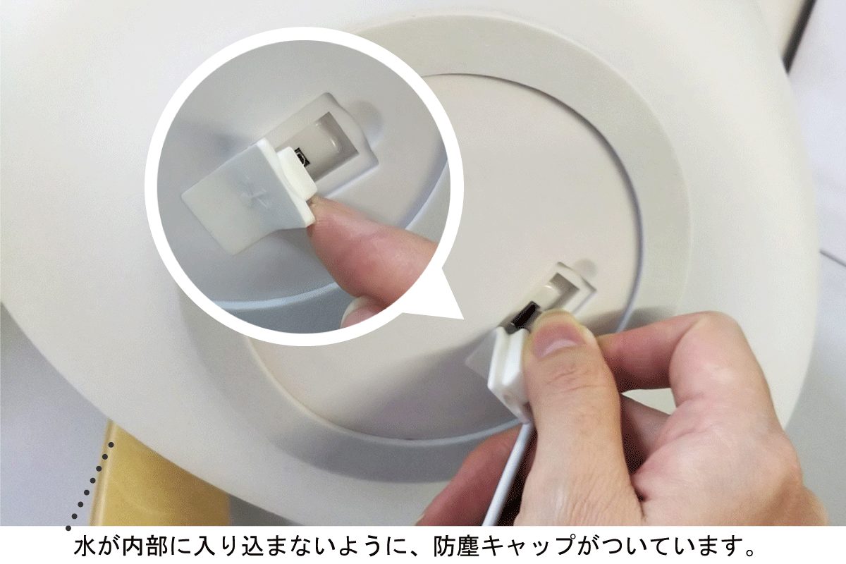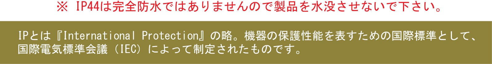 防水・防滴規格「IP44」に適応しています。これはあらゆる方向から水滴をかけても問題ないことを意味していますが、完全防水ではありませんので水没させないでください。水没が原因で故障した場合は保証対象外となり、有償でのサポート対応になる場合がございます。