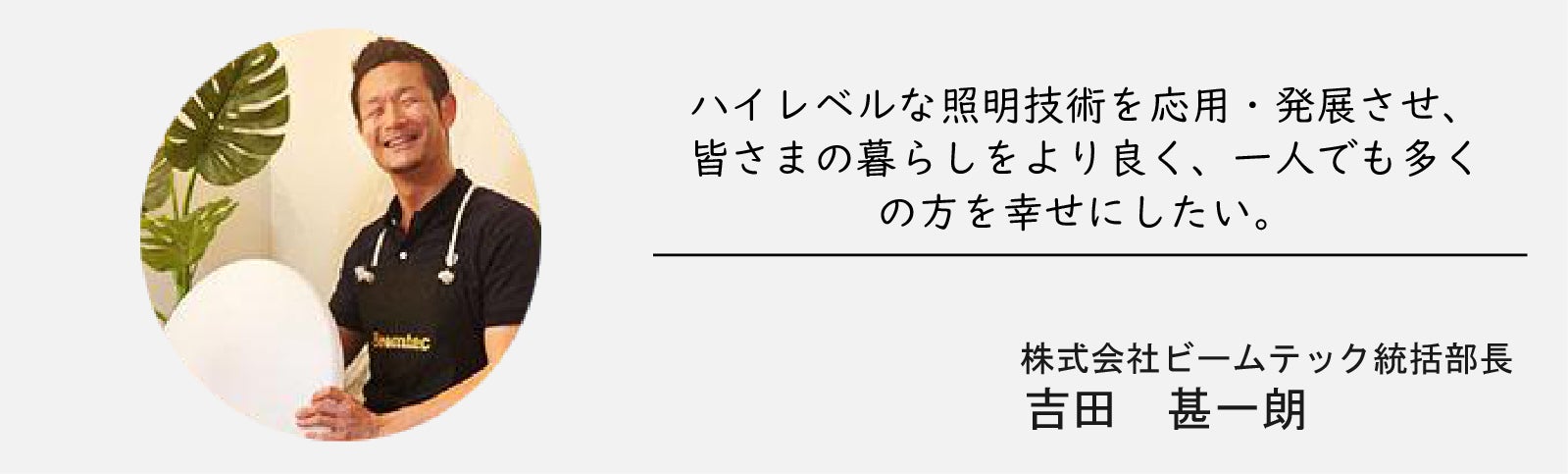 はじめまして。株式会社ビームテックと申します。弊社では、2つの理念をもとに運営しております。ひとつは、『環境問題について』。日常生活に欠かすことのできない『明かり』だからこそ、環境への負担も極限まで減らせるよう、商品開発の取り組みを続けています。そしてもうひとつは『照明技術の進展に寄与すること』。ご存知の通り、LEDは日本の開発者たちによって生まれました。ハイレベルな照明技術を応用・発展させることはもちろんのこと、皆様の暮らしをより素敵なものへとご提案していくことも使命とし日々精進しております。