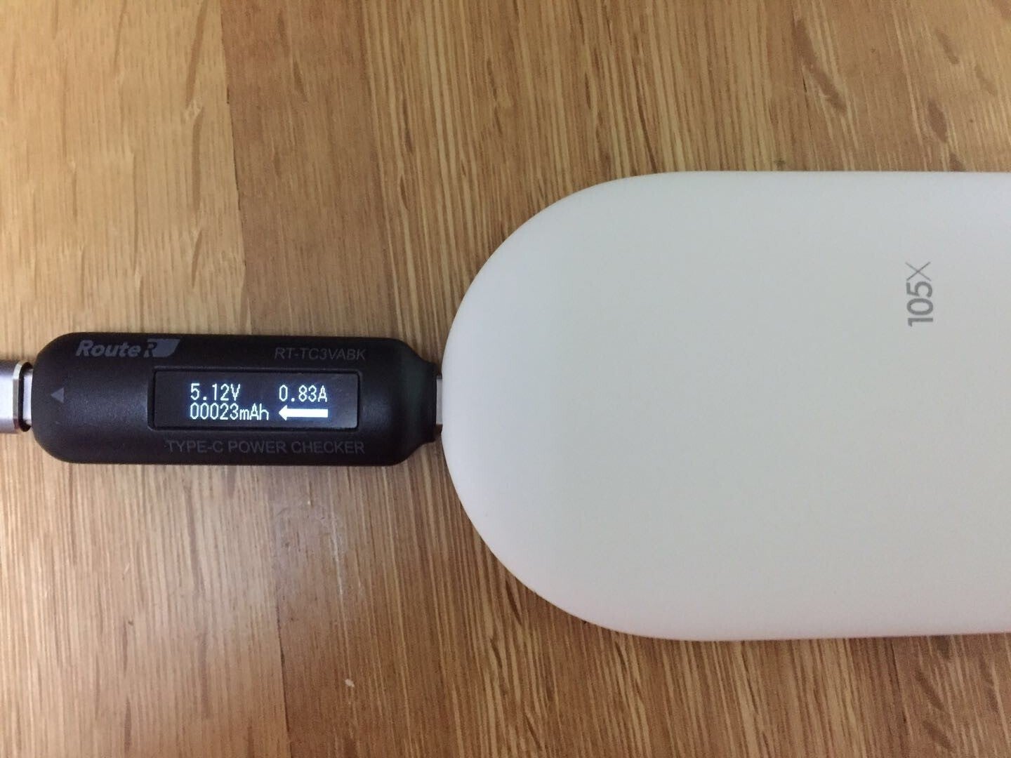 上の写真は、105Xのモバイルバッテリー Type-C端子にスマートフォンを接続し、105Xから充電をしている時のものです。105Xから「出力」の状態です。加えて下の写真は、外部バッテリーを105XのモバイルバッテリーのType-C端子に接続して、105Xを充電している時のものです。105Xへ「入力」の状態です。スペックは以下です。「出力」: 5V 3.0A (Max) 「入力」: 5V 3.0A (Max)