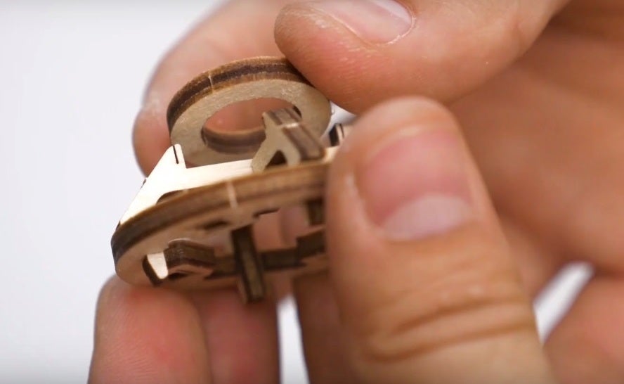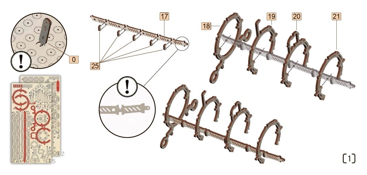 外した部品を一個ずつ組み合わせていきます。接着剤は不要で基本的に工具やその他のものも不要です。はめ込む為に木の突起部分もちょうどよい力具合ではまります。また、楊枝のような先端の尖った木の棒でパーツ同士を繋げていきます。