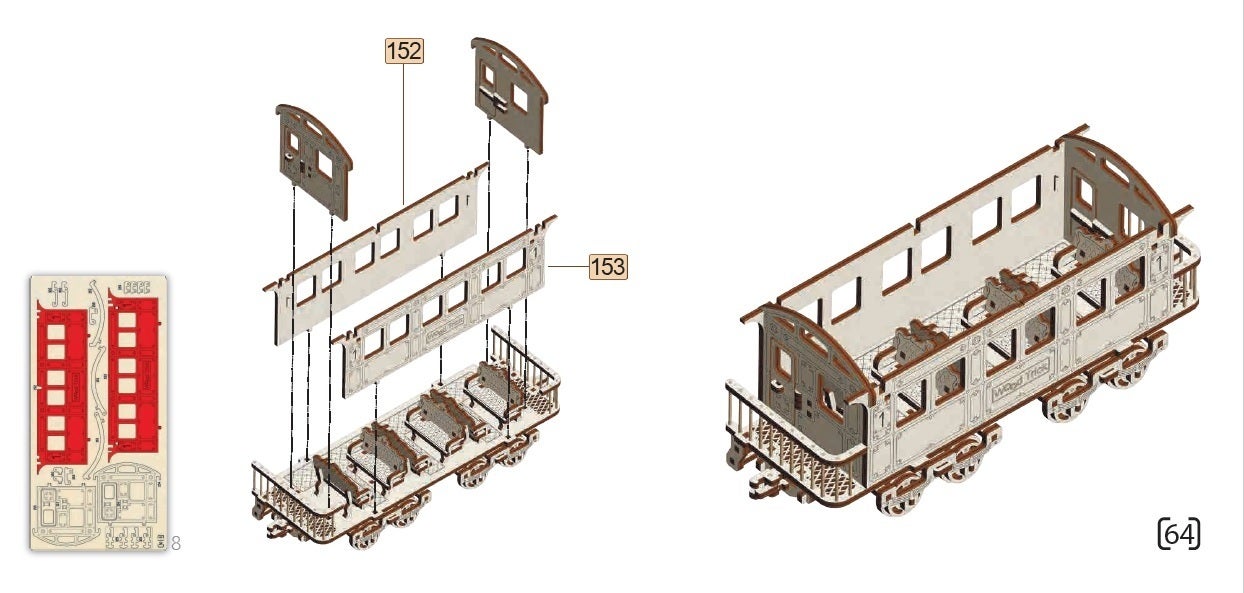 マニュアルの中は全て本物通りの正確なイラストで示されているので順を追って組み立てしやすいです。また、どの木の板のどのパーツか、ちゃんと赤色で示されているのでパーツを間違う事もありません。