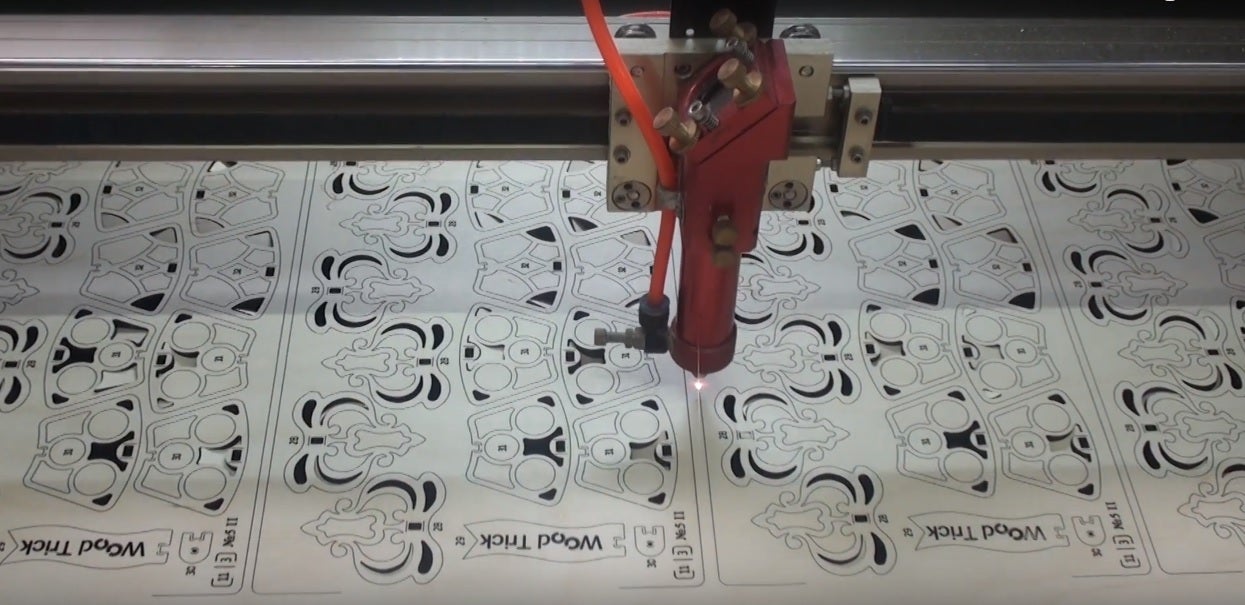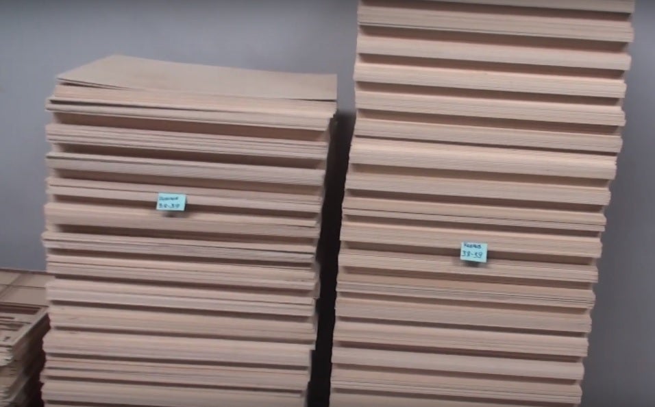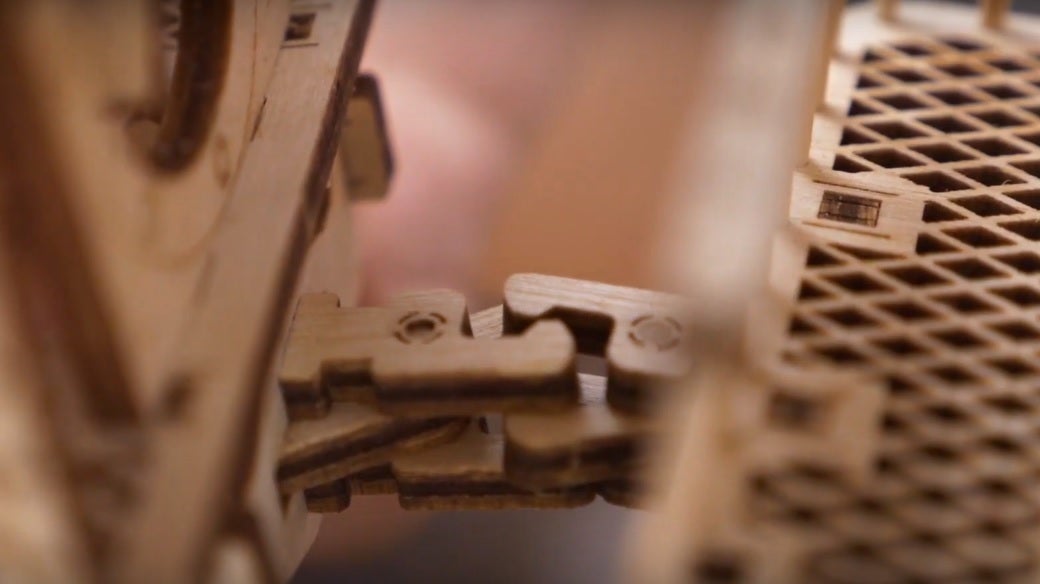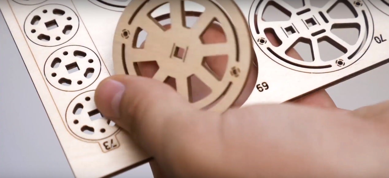 箱を開けるとレーザー加工で作られたたくさんの部品がある木の板が8枚入っています。一つ一つの部品だけでも既に芸術的でまじまじと見入ってしまうほどです。