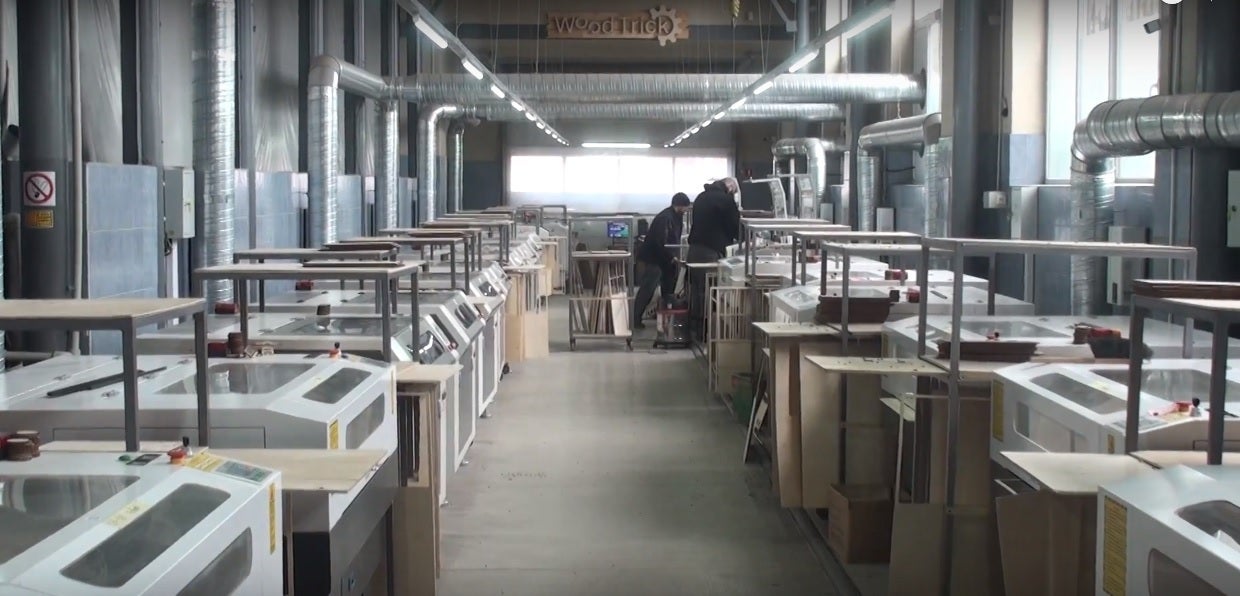 工場内部。上記の木材版をレーザー加工機にセットして部品を作っていきます。