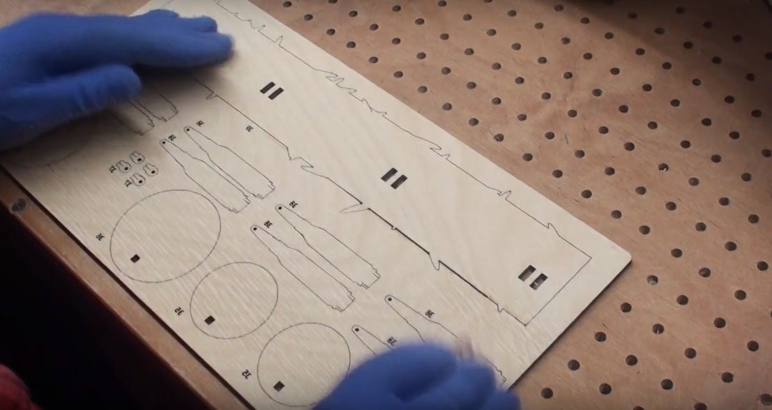 マニュアルに沿って部品を1個ずつ木の板から取り外していきます。部品は既にレーザーでくり抜かれていて四方の2ミリほどが繋がっているだけですので、少し力を入れて押せばすぐに外れます。多少強引に押しても部品が割れることなどもほとんどないほど良くデザインされ、レーザー加工されています。