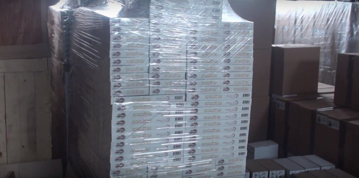 箱に包まれた商品は輸送中に傷つかないようにラップで厳重に包みます。