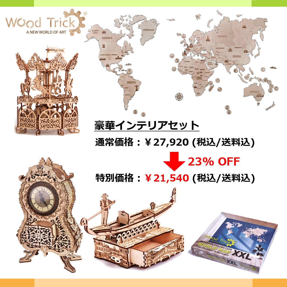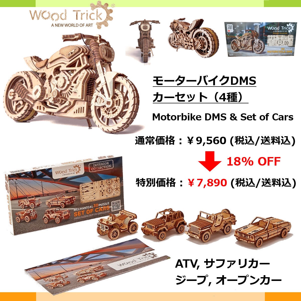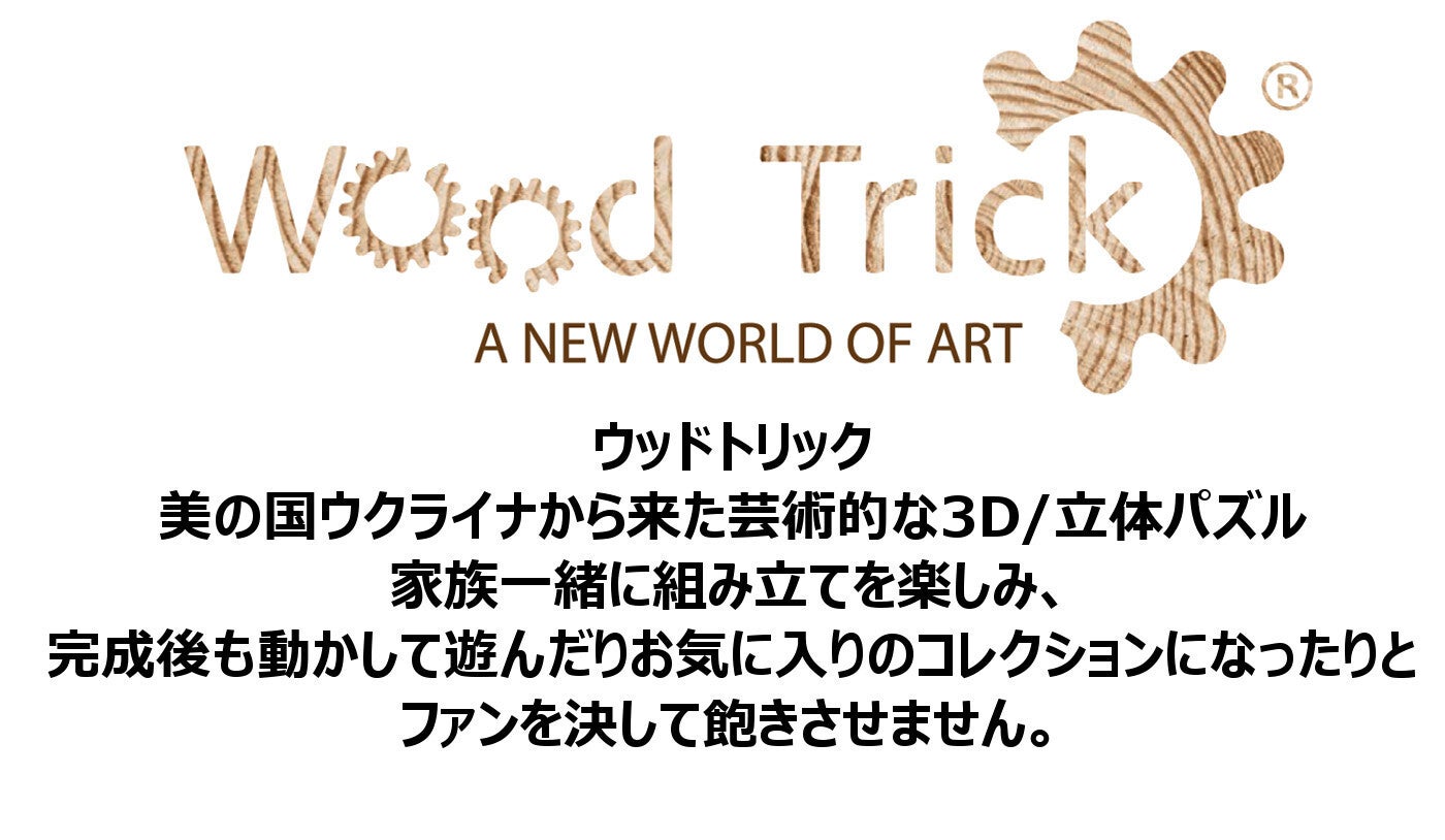 ウッドトリックは今まで乗り物や動物、機械など様々なジャンルの3Dパズルを開発してきました。そのパズルを一つでも組み立てた人はそのクリエイティブな世界へと魅了され、もっとたくさん、そしてもっと難しいパズルをつくりたいと感じるに違いないとウッドトリックは確信しております。全ての作品は組み立てた人たちの創造性を誇らしくに象徴する美しく華やかな作品・コレクションとなります。未来のクリエイティビティの学習と発展を存分に促進する事に焦点を置いて彼らのエンジニアに開発された私たちの創造性豊かで高品質・エコフレンドリーな作品に関わりたい方々をウッドトリックは心から歓迎いたします。