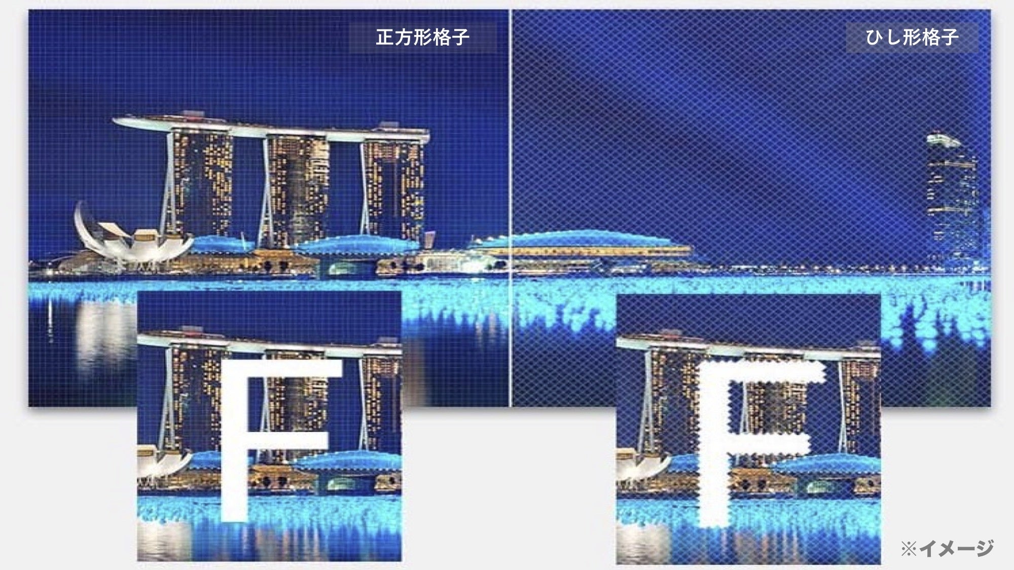 また、液晶のドットの格子は、気になる人にとってはとてもストレスになると言われています。従来はひし形の格子が一般的ですが、「響輝」は正方形の格子で投影します。これによって大幅にパフォーマンスが向上しました。下の画像はイメージですが、ひし形格子と正方形格子では歴然とした差があります。