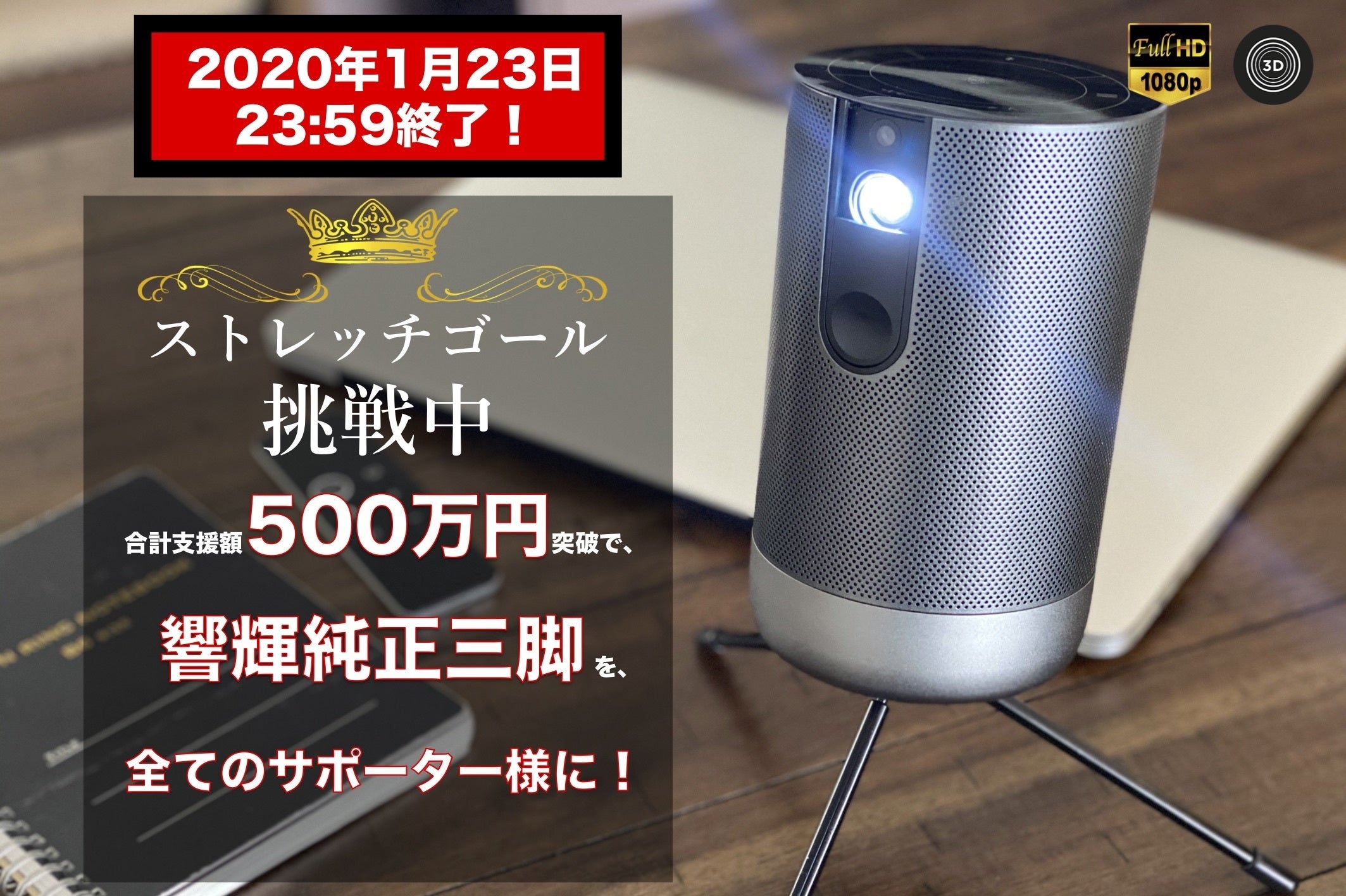たくさんのサポーター様の熱いご支援のおかげ様で、1/22の夜間にストレッチゴール1000%を達成いたしました!チームスタッフ一同、深く御礼申し上げます。これにて、全てのサポーター様に響輝純正三脚をプレゼントさせていただきます!