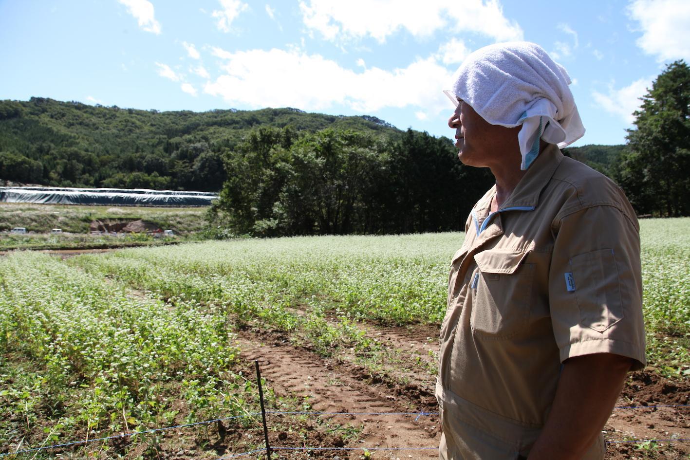 農機具を保管する倉庫の奥から「地元産・手打ちそば」と書かれた大きな看板を見つけ出した長谷川健一さんは懐かしんだ。