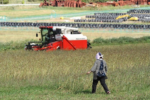 長谷川健一さんがトラクターでソバの種を蒔くかたわらで、種や肥料を準備しながら連れ合いの花子さんが言う。
