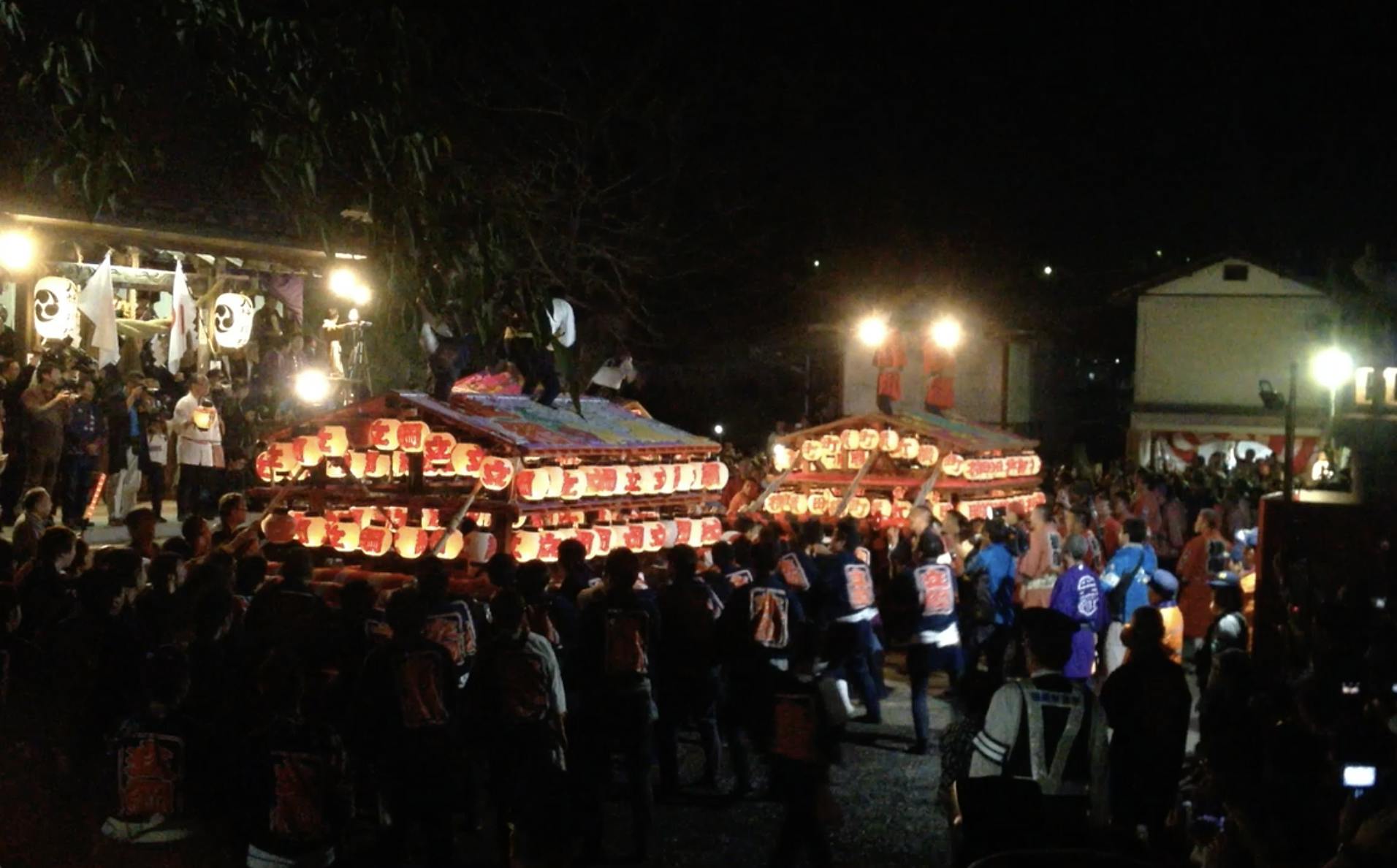 大勢の若者に担がれた6台の太鼓屋台が激しくぶつかり合い、神輿の宮入りを阻み合う。
