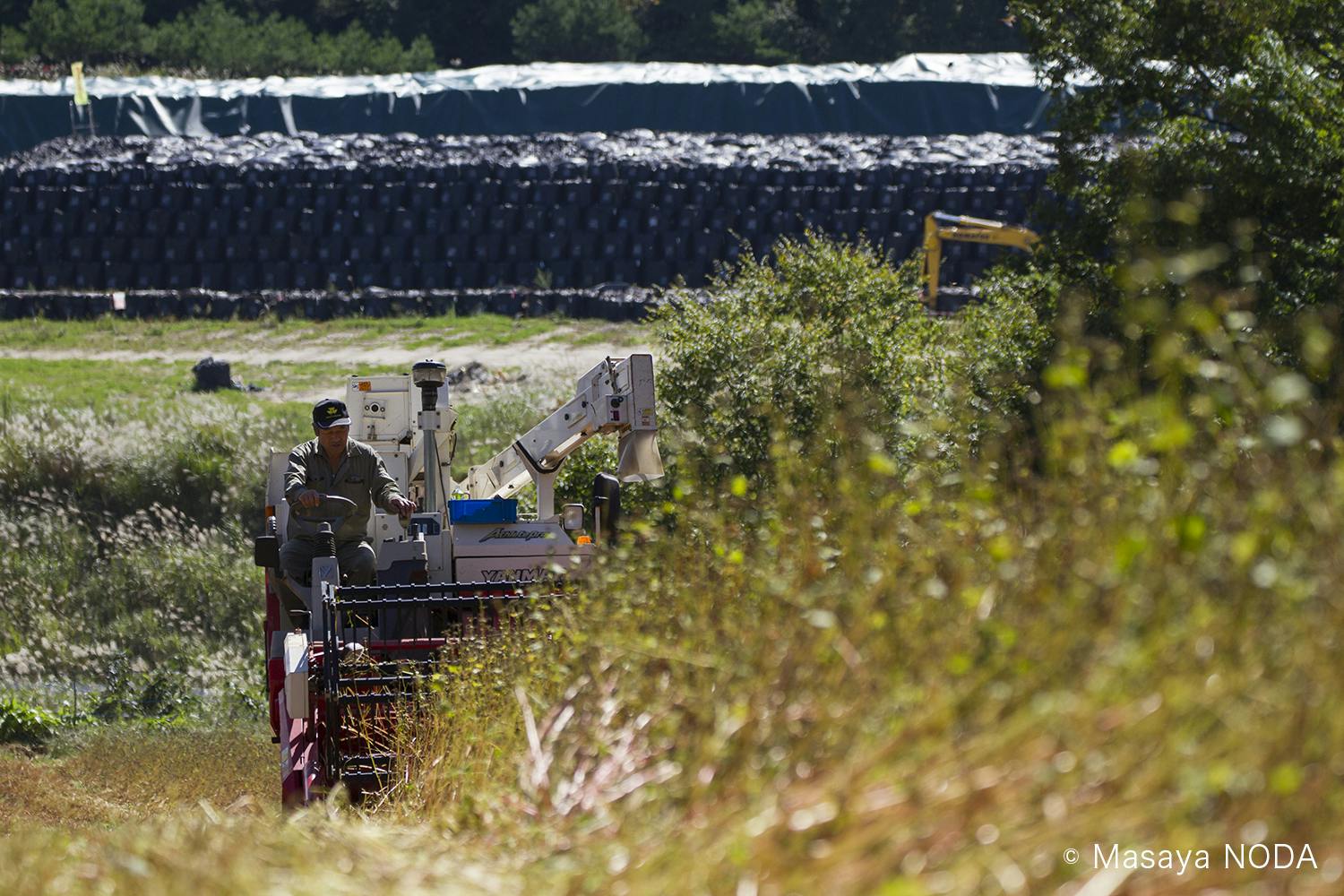汚染土を背に、栽培実験した蕎麦を収穫する長谷川健一さん。