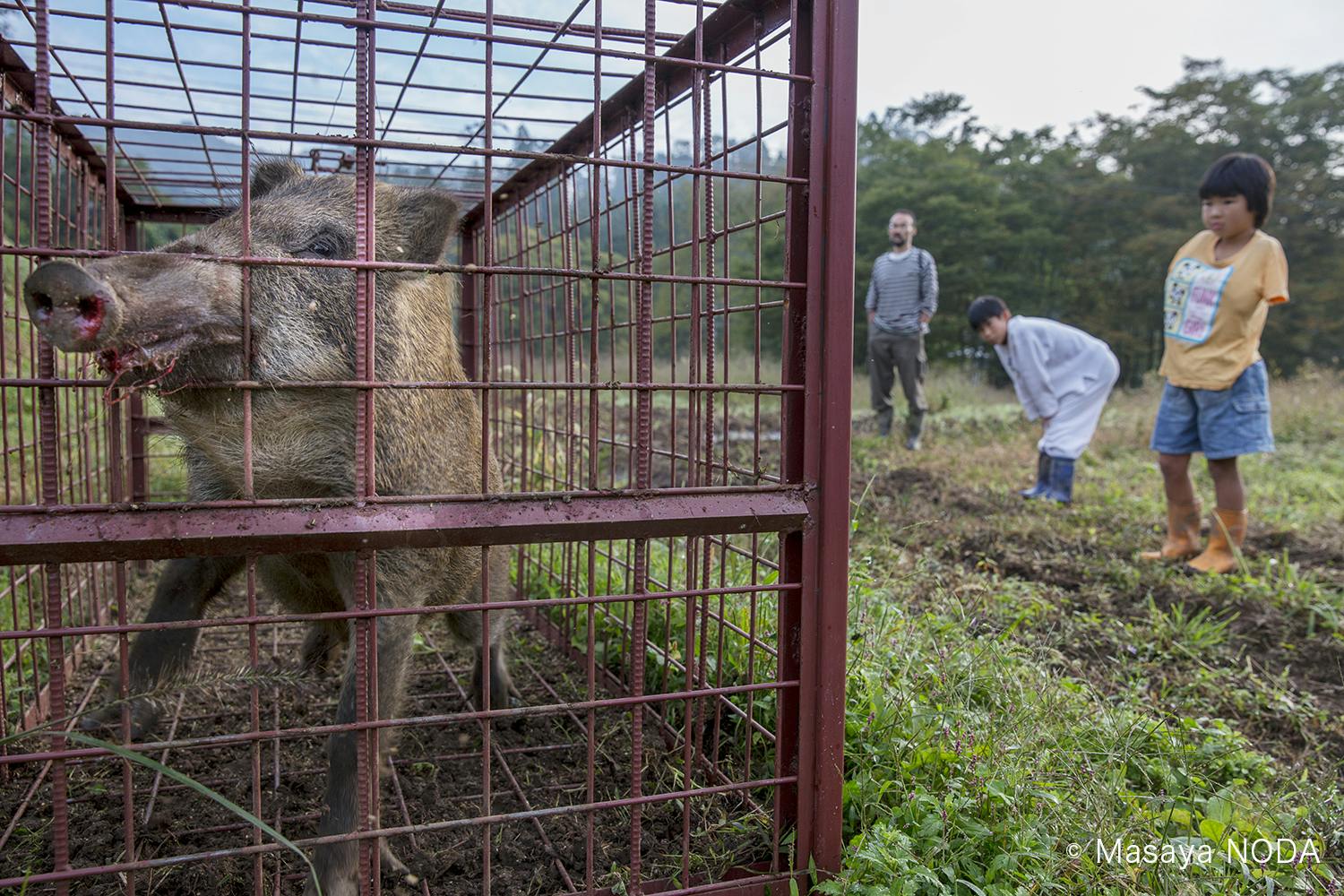 ある朝、みそ工房前に仕掛けた檻の罠に、イノシシが掛かっていた。鉄柵を倒す勢いで暴れるイノシシを前に、太田家の子どもたちも立ちすくんでいる。
