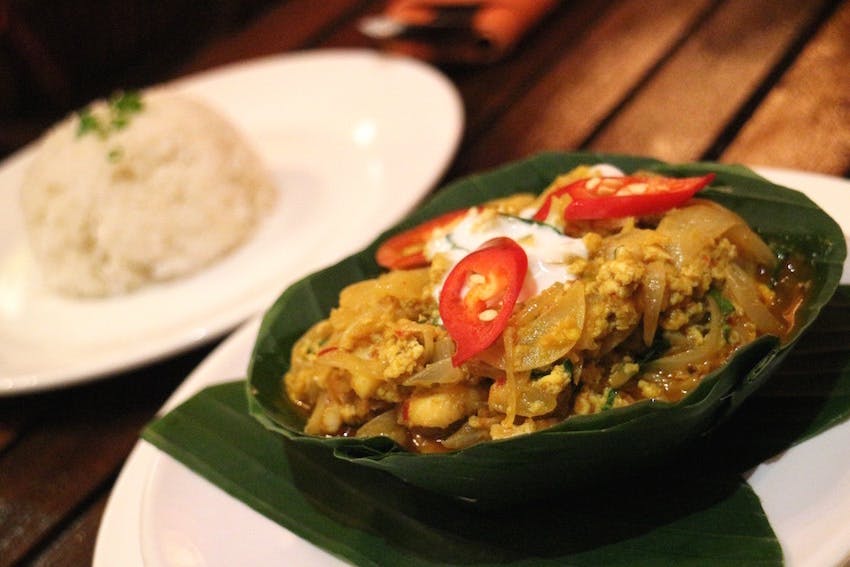 上の画像がそのアモックです。淡水魚の切り身か鶏肉、そしてココナッツミルクとカレーをバナナの葉で包んで蒸したものだそうです!