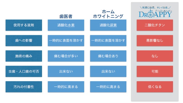 歯医者での施術、ホームホワイトニングと性能を比較してみても、DR歯APPYは歯への悪影響も痛みもありません。