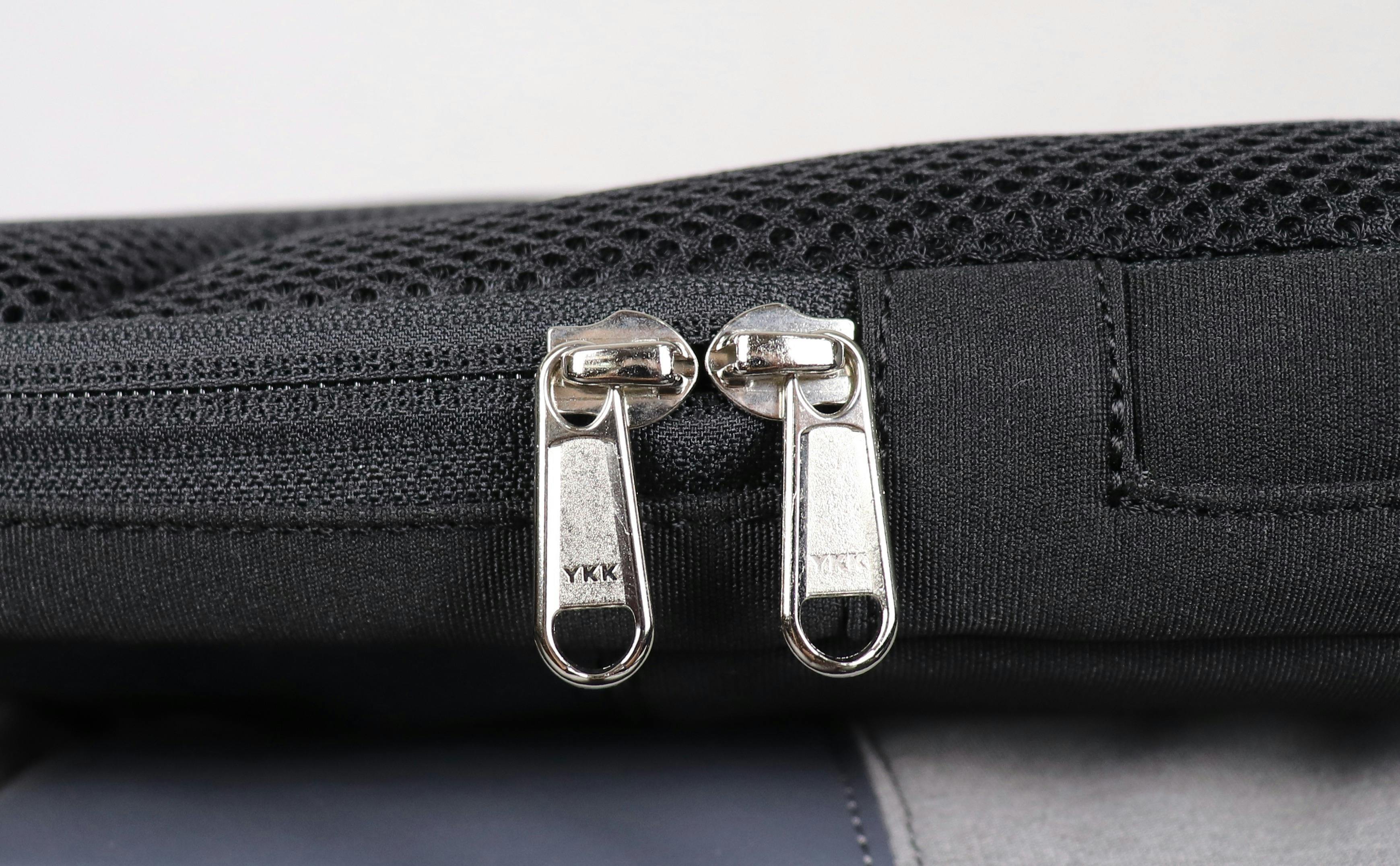 ジャケットを着ている場合は盗難防止に効いていますが、外側に背負った場合も盗難防止のため、ファスナーを隠せるようなデザインを採用しています。さらに、スマホや財布を取りやすいように、底部には隠しポケットもあります。