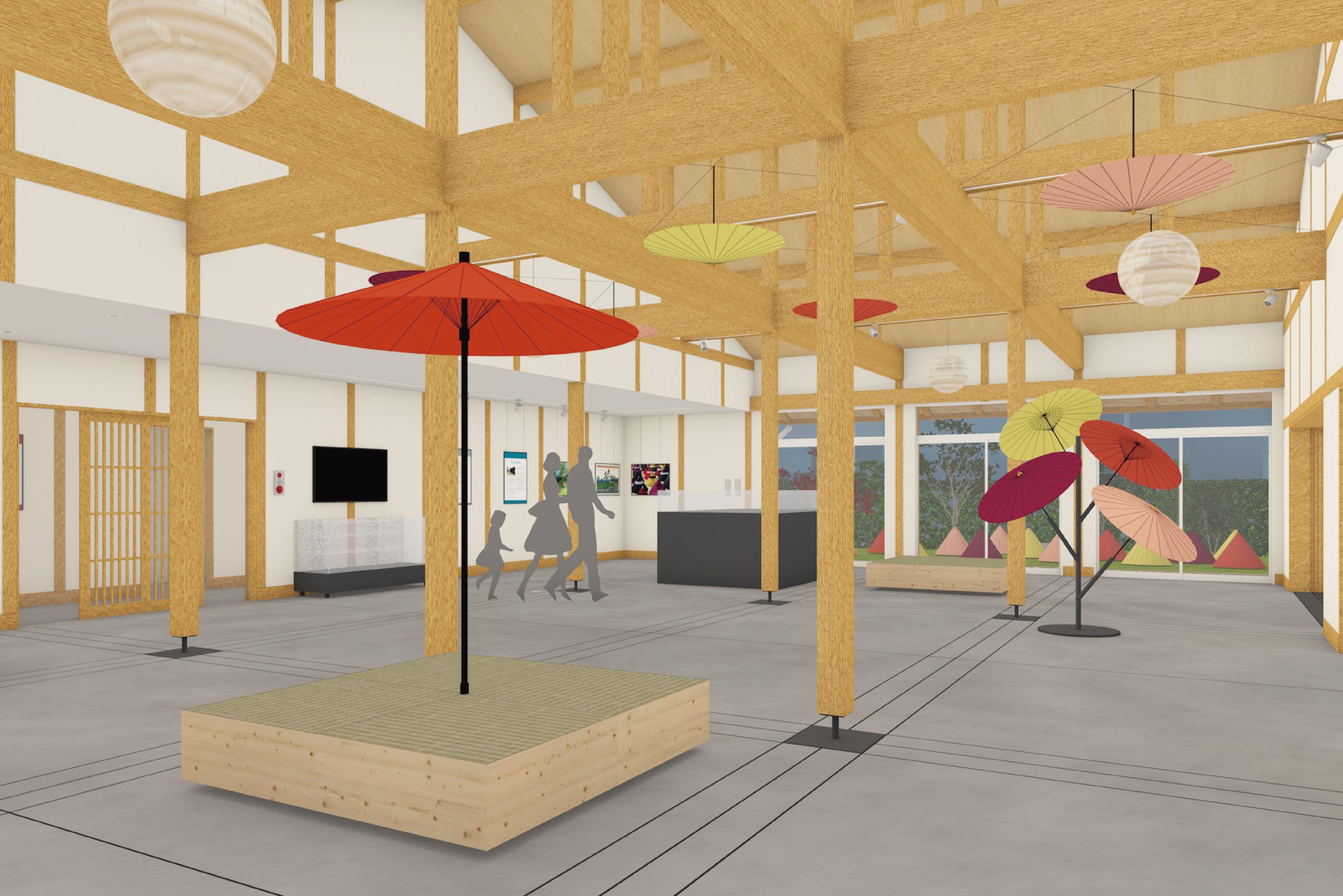 そこで、交流センターの中には和傘の説明パネルと合わせて、実際に、体感してもらえる展⽰スペースをつくることにしました。
