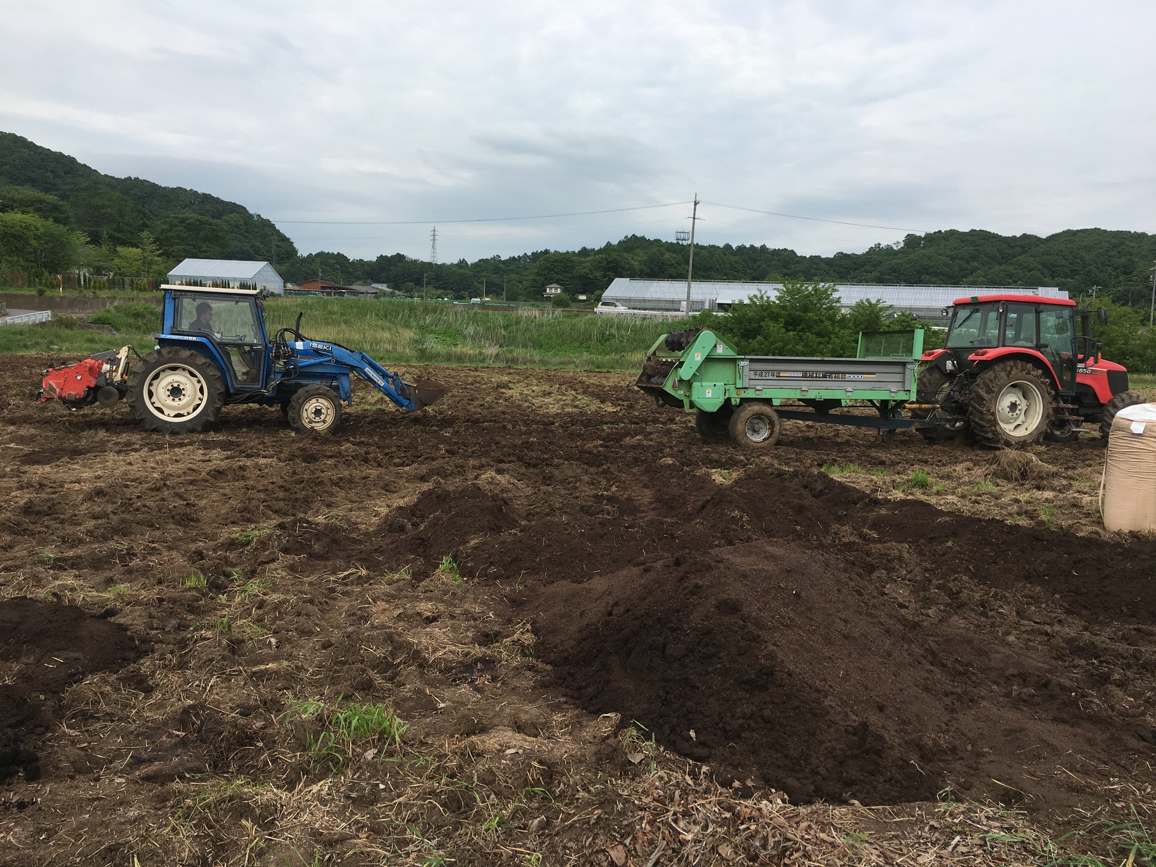 有機堆肥を20t大型トラックをレンタルして自分たちで搬入し、マニアスプレッターで畑に撒き、乗ったことのないトラクターを運転してプラソイラーとロータリーをかけて耕しました。