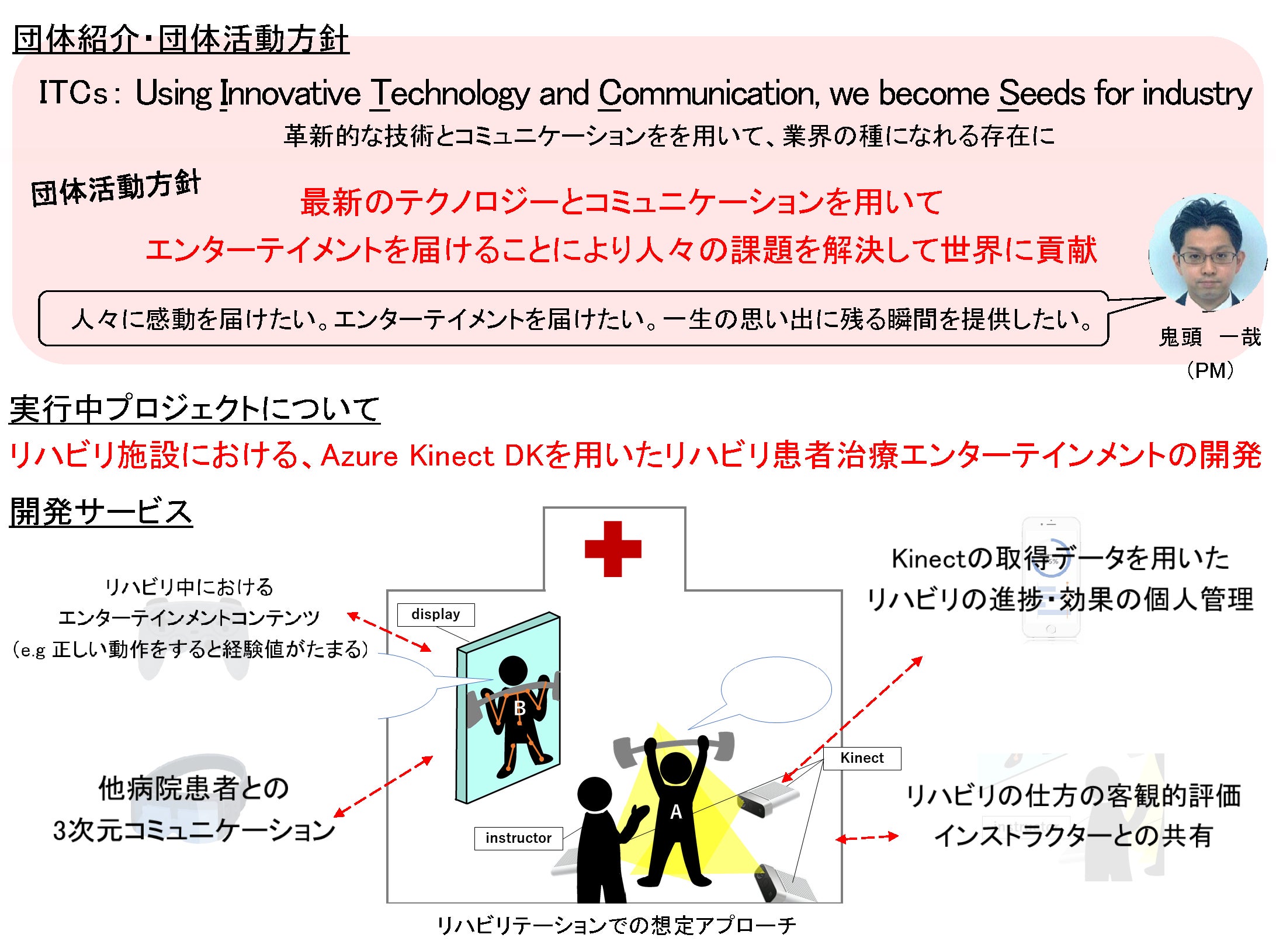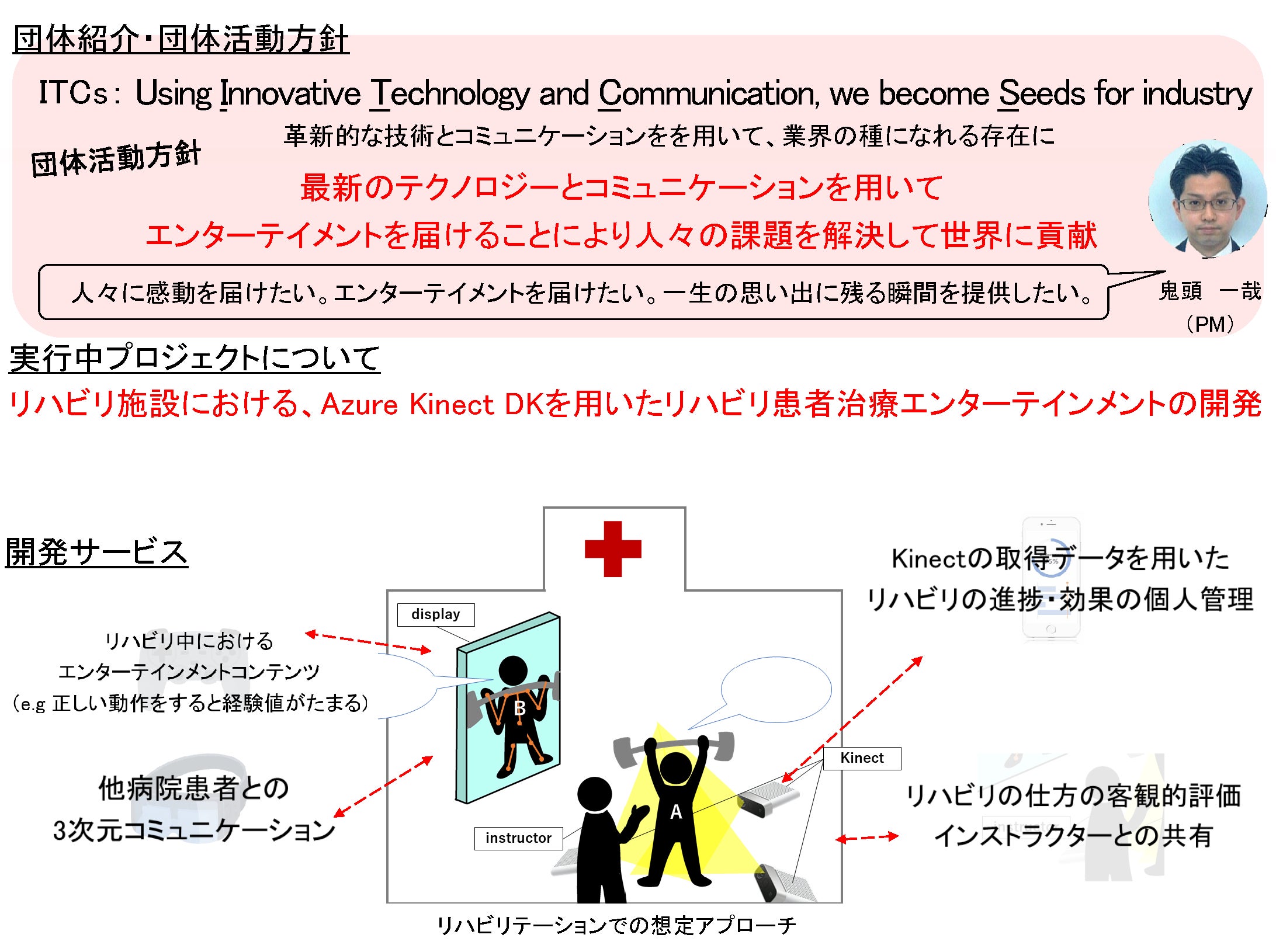今回我々は、リハビリテーションでの課題に注目し、これをエンタメで解決できないか?ということにチャレンジしています。このプロジェクトは、コンセプトテストやプロトタイプテストを得た後、私たちが解決方法の機材として用いている「Azure Kinect DK」を製造しているマイクロソフト社への提案を考えております。(実際にマイクロソフトへの提案をすることは決まっております)