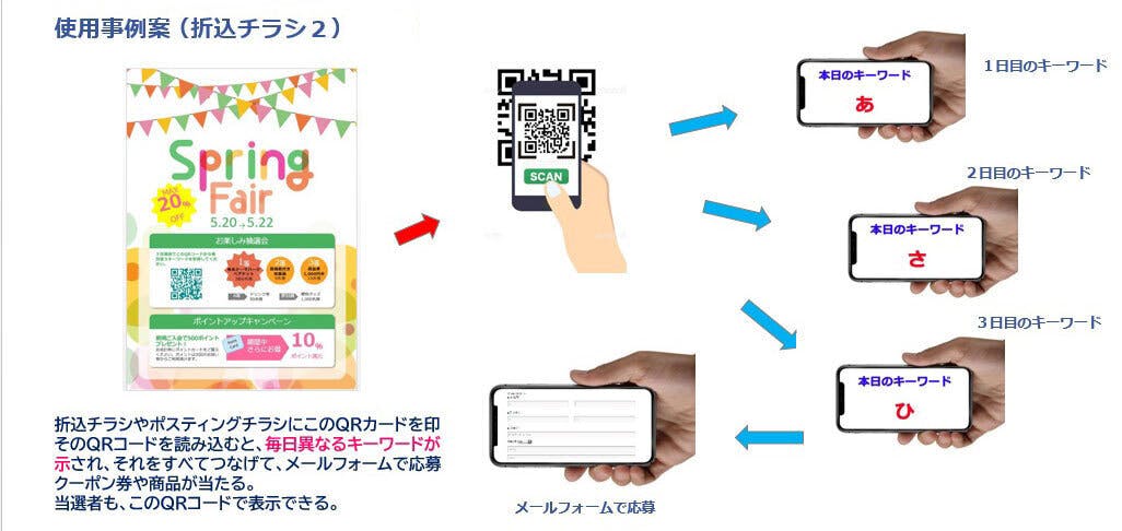 また、少しエンターテイメント性を導入して、そのQRコードを3日間毎日読み込んでいただき、キーワードを探して、クーポン券や商品が当たるくじに応募する等が考えられると思います。