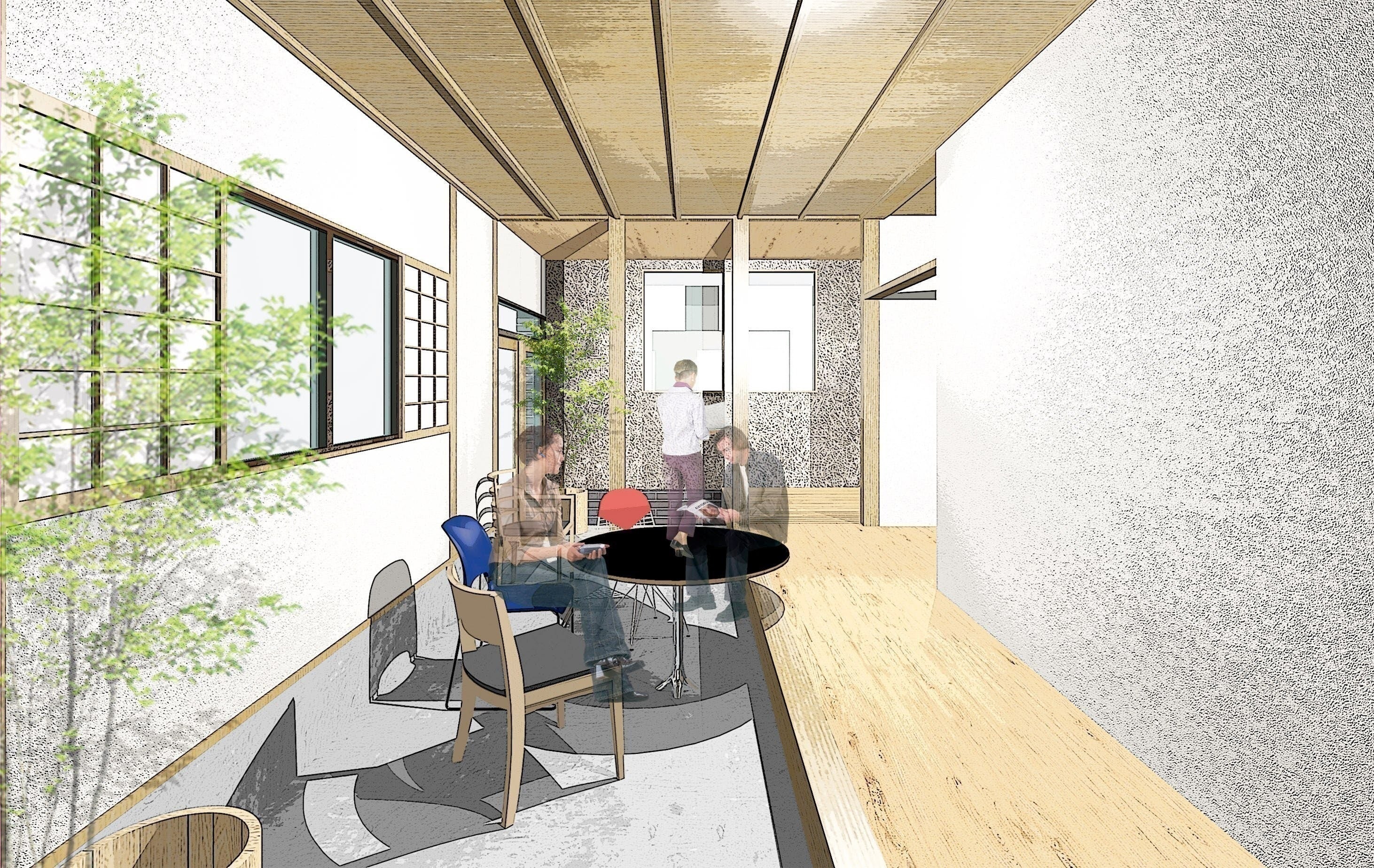 < 宿のラウンジスペースのイメージ >