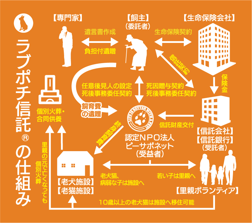 飼主様ご自身の生命保険を利用して、飼主様亡き後のペットの飼育費を捻出したり、飼い主様の遺産をペットの飼育費の為に利用できるような遺言書を作成したりと、飼主様亡き後もペット達が健やかな生活を送る事をお約束した画期的な仕組みです。