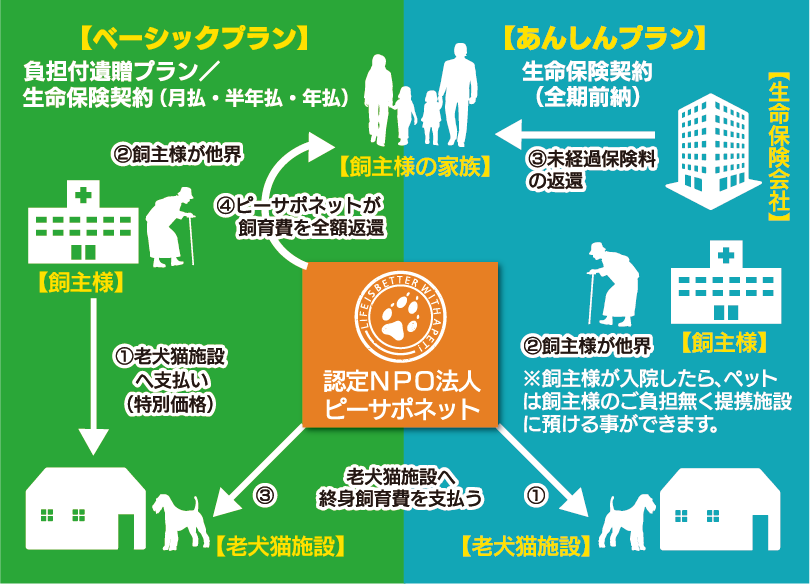 ①飼主様が入院もしくは介護施設へ入居した際は、老犬老猫施設へ預ける。この段階からピーサポネットが老犬老猫施設へ終身飼育費を支払う。