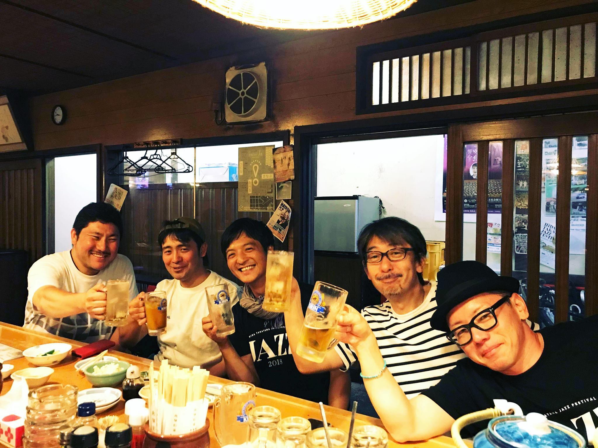 打ち上げに集まったメンバー。みんなフェスTシャツ着てくると思ったのに、2人しか着てない