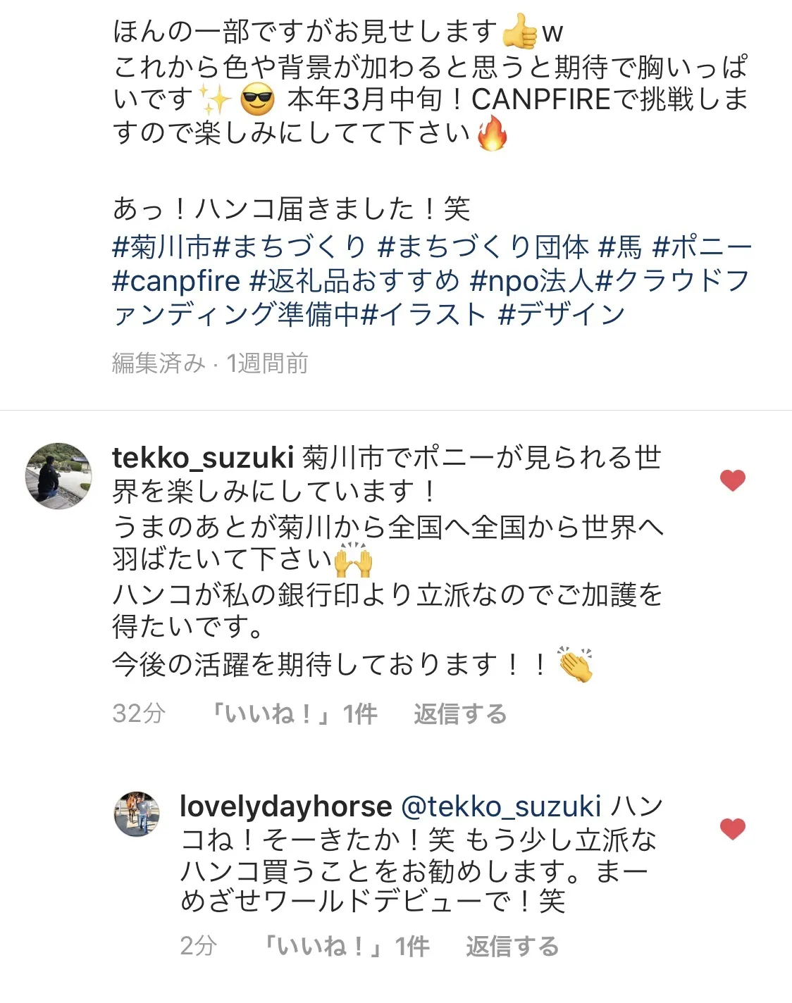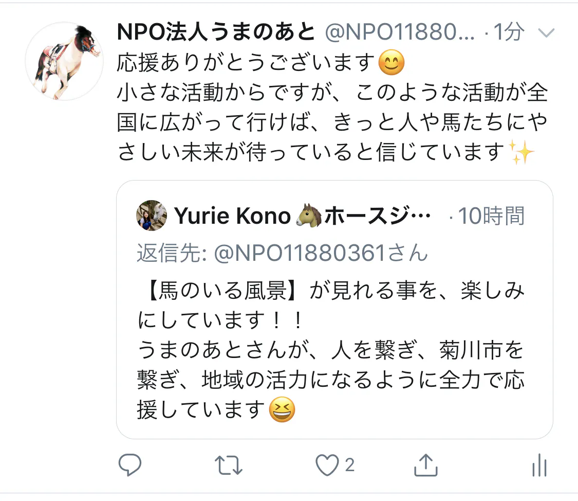 2020/04/28 11:03目標金額 50万円達成しました。ご支援並びにご協力頂きました方々に感謝致します。しかし、まだ期間は残されています。モヒカン君には「気持ちよく」仕事をしてもらいたいので、新品の馬具をプレゼントしたいなと考えています。期間は短くなりますが、引き続きサポートの程、宜しくお願い致します。本当にこのプロジェクトを実施するにあたり、色々な方との繋がりができたことを、一番の成果であったと感じております。そして、クラウドファンディングが終了した後も、講演会やプロモーション動画などの使命(返礼)がありますので、気を抜かずに頑張りたいと思います。今後も、活動報告を「うまのあとホームページ」内のブログで更新していきますので、お楽しみにして下さい。(出来る限り毎週頑張りますw)。プロジェクト終了時に改めましてお礼申し上げます。 もっと見る