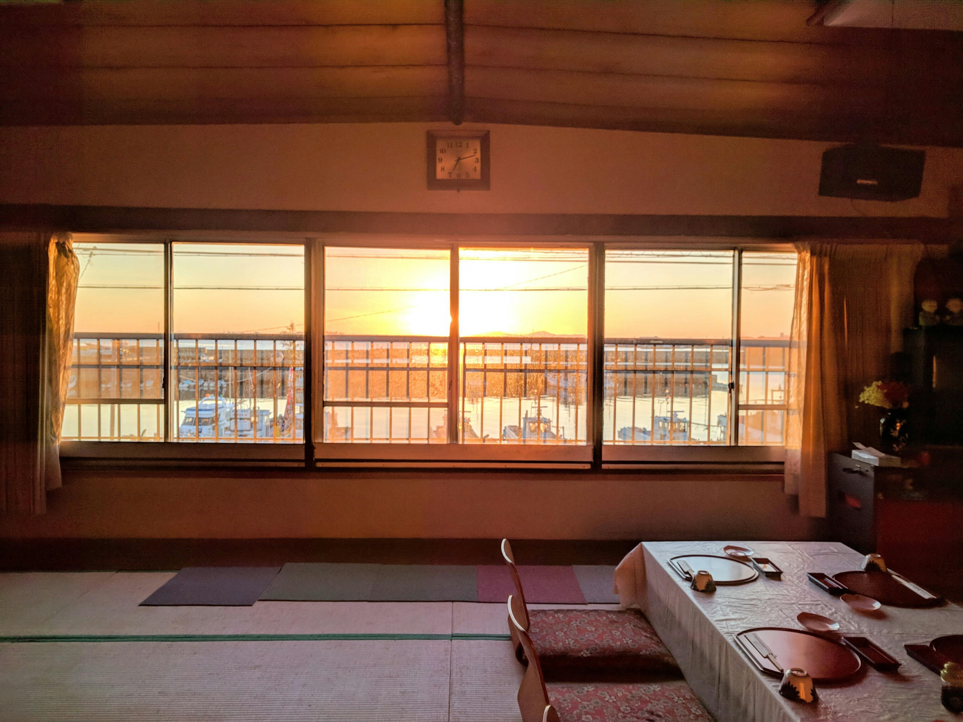 ご覧のように当館の目の前には海の景色が広がり、朝陽と毎朝ご挨拶をさせていただいております。