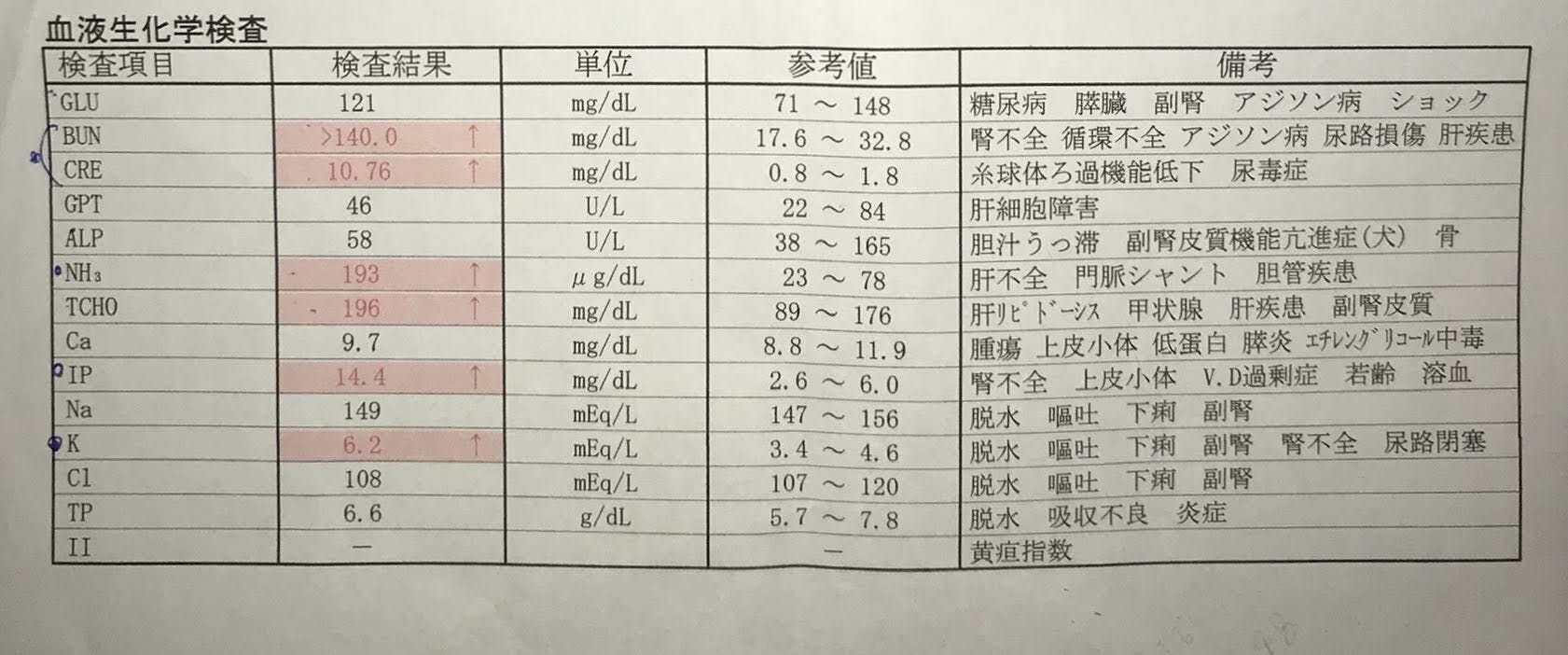 ↓年末時の採血結果です。上から3番目のCREという値は老廃物をうまく捨てられているかという値を示すものらしく、こちらの数値もかなり高くなっています。