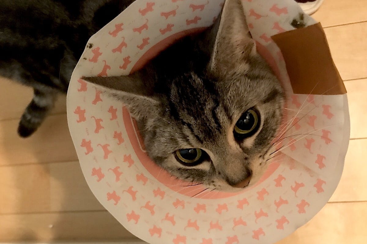 傷をなめないように、そのままエリザベスカラー付きで帰ってきました。そんな姿も愛おしい。。