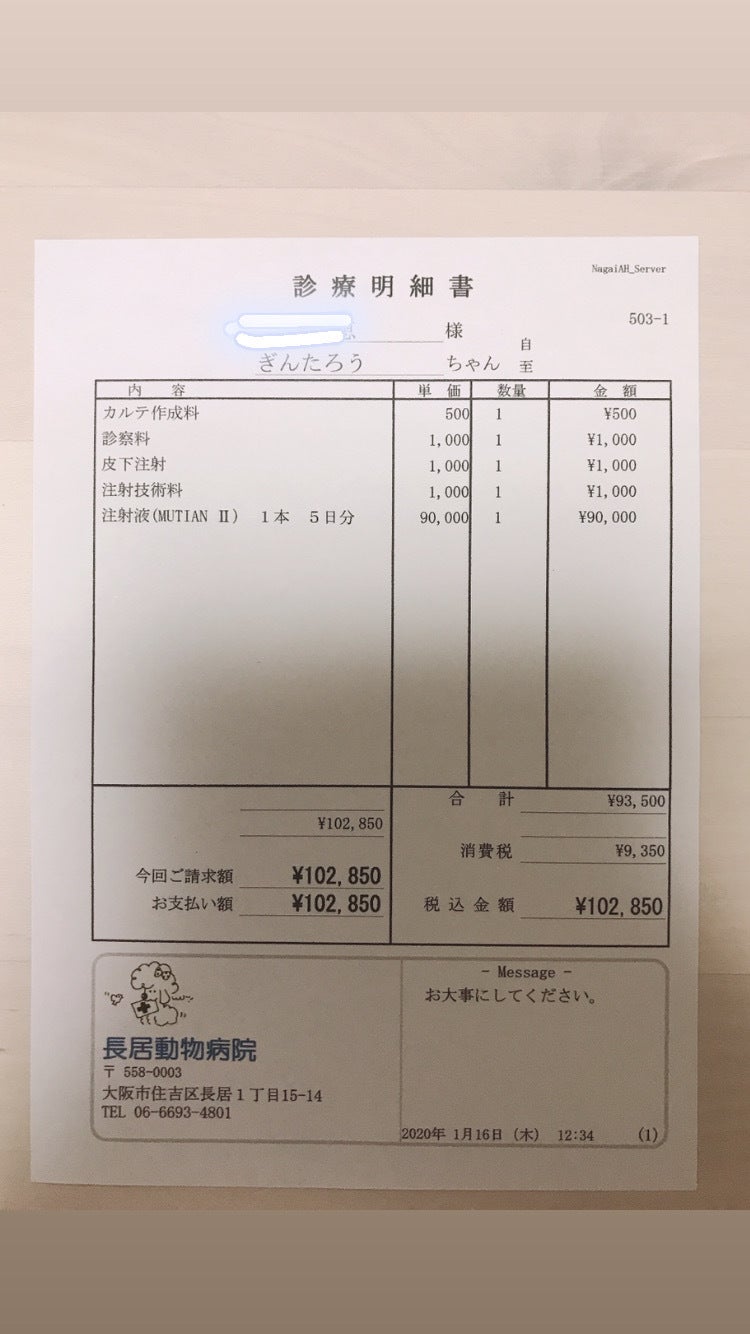 治療にかかった明細書は必ずパトロン様全ての方に必ず報告、明細書の写真メールにて