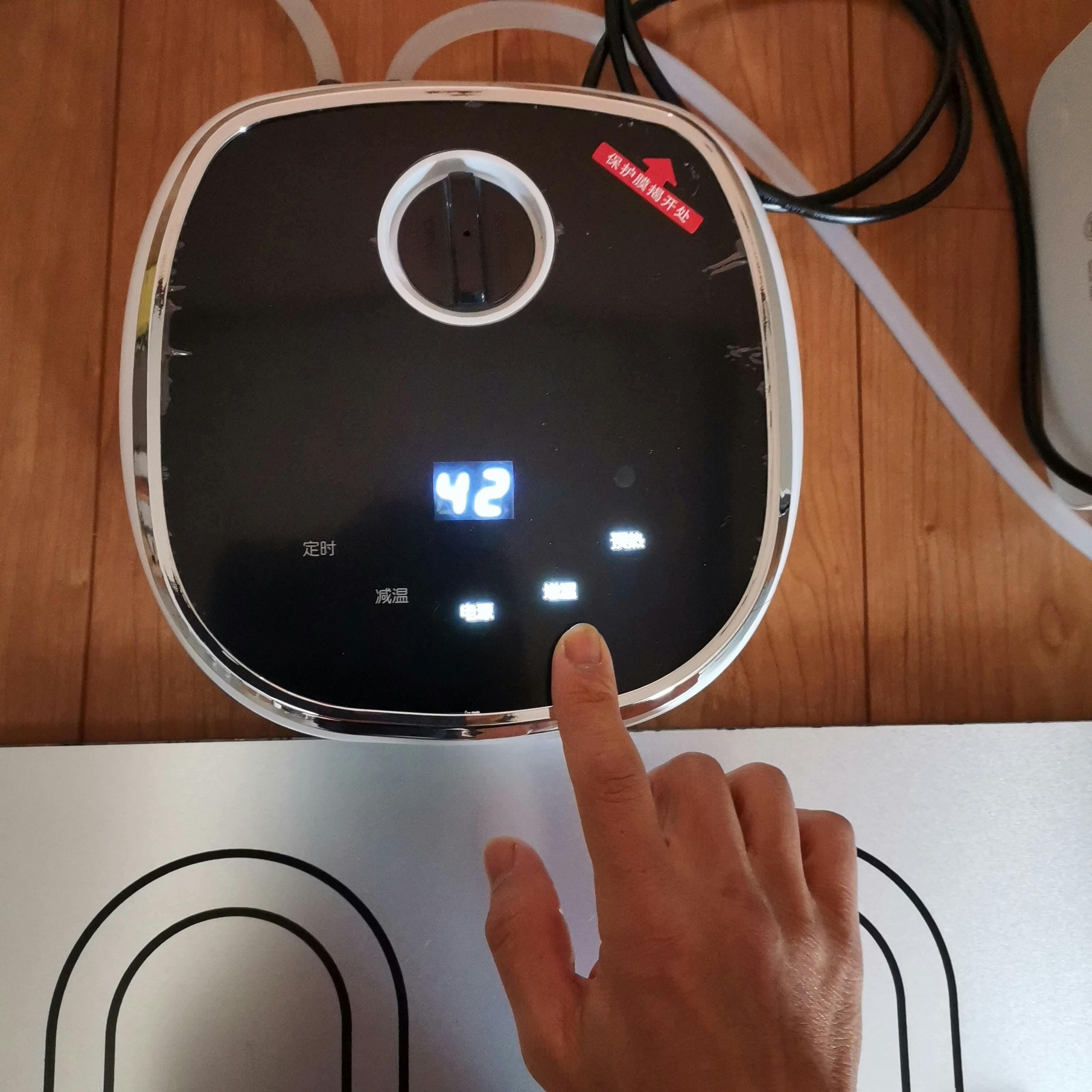 6、水(蒸留水を推奨)を網の目まで入れ蓋をする。直接触れるかリモコンで温水調節する。