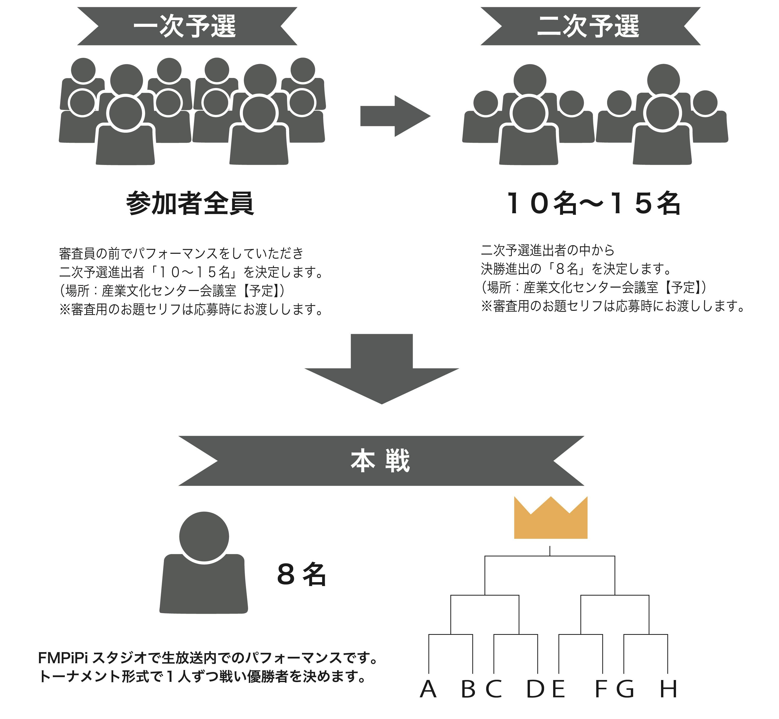 ストーリーは話し合いでFMPiPiラジオドラマ番組「さかり場」担当のスタッフと一緒に話し合って作ります。(優勝者自身で台本を書いてもOK)
