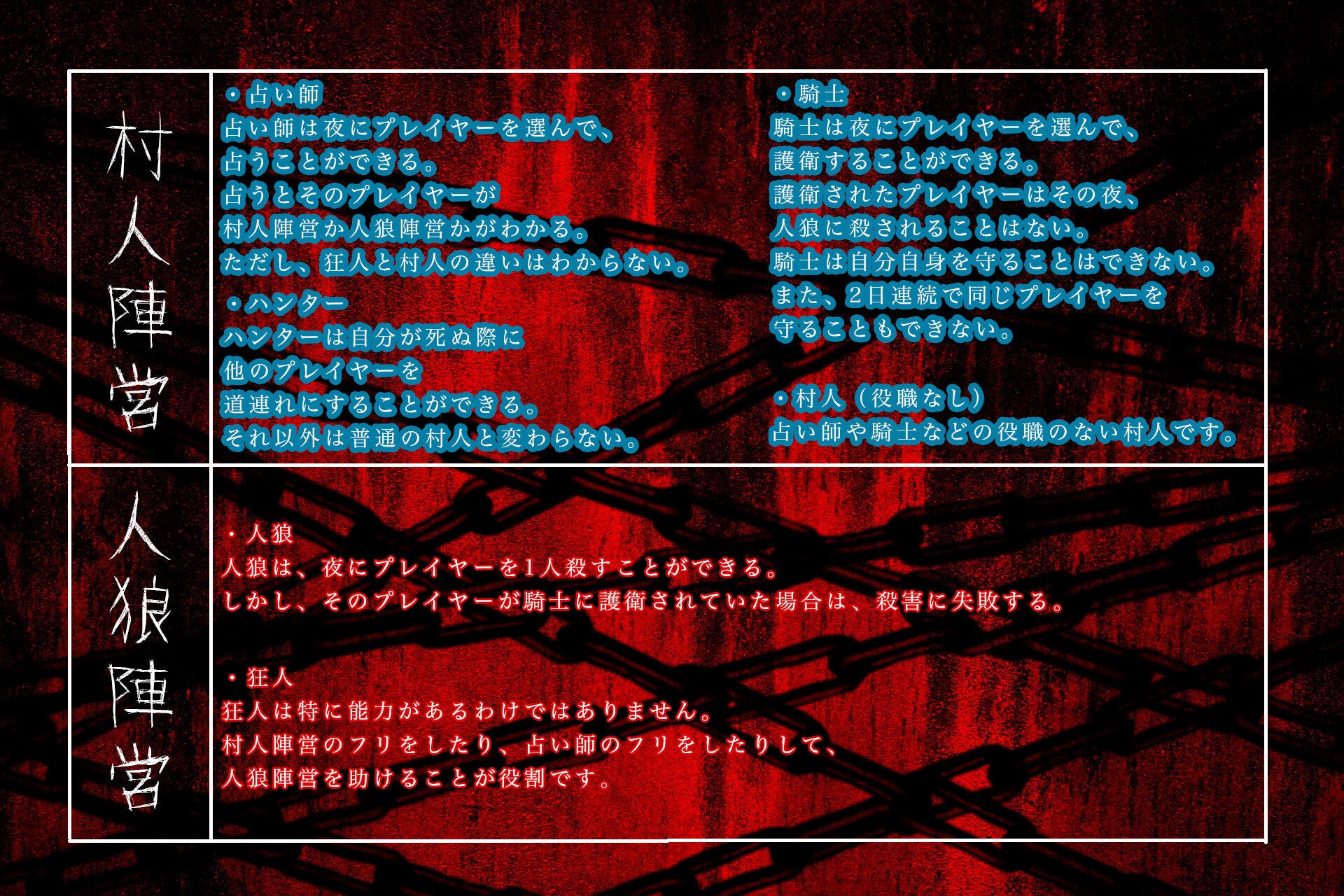 村人・・・村から人狼を全て処刑すれば勝利