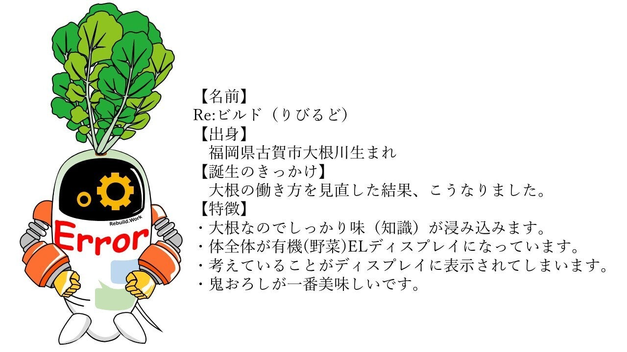 こがみらいは「学び直し」による働き方の再構築を全国へ広げる為、「Re:ビルド(りびるど)」をイメージキャラクタとして展開し、地域における「学び直し」導入のネットワーク作りを進めていきます。このキャラクタは古賀市を流れる大根川をモチーフとして考えられ、「創造を超えた未来が待っている」というメッセージと「学び直しによる働き方再構築は誰にでも必要」というメッセージを込めました。