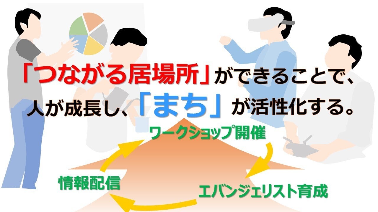 これらのワークショップを通じて、エバンジェリスト(伝道師)を育成します。エバンジェリストには「話す力」「伝える力」「聞く力」をつけて頂き、新しいワークショップの開発を手伝って頂きます。エバンジェリストを育成することによって、新たな「つながる居場所」を増やしていきます。