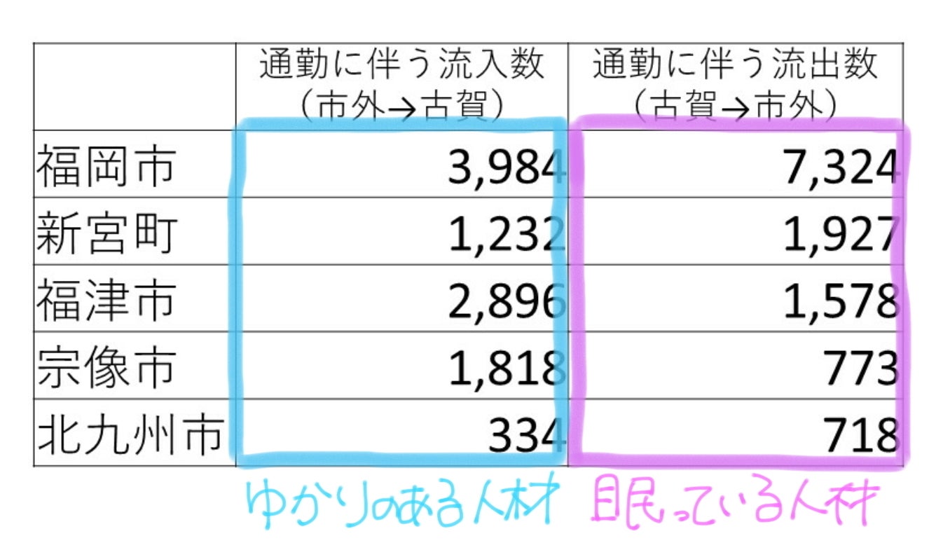 なぜなら「ベットタウン」には都市部で活躍している人達が住んでいる(人財として古賀に眠っている)ということです。また、古賀には工場地域もあり、働く場所が充実しています。街並みの賑わいはないけれど、人の賑わいはあると考えました。