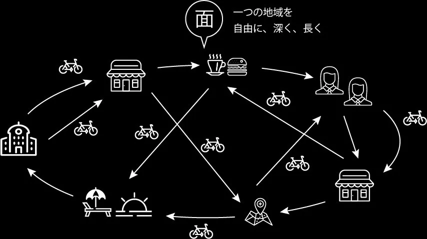 徒歩では遠い、車では近すぎるのと施設内移動はできない。 そんな時に役に立つのが自転車だと考えています。街をしっかり楽しんでもらうためにも自転車の活用は必要不可欠だと考えています。自転車導入のメリットについては後ほど詳しく記載します。
