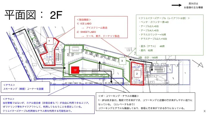 <コワーキングエリア(レイアウトは仮) 2階 合計:140席
