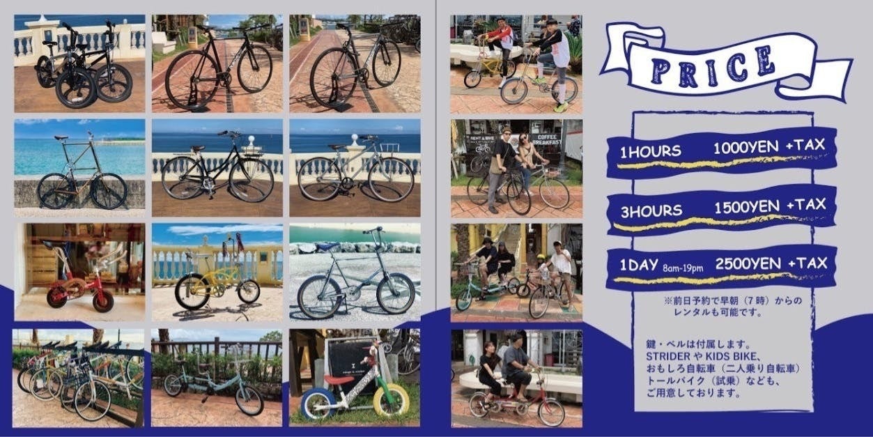 普通の自転車を貸し出すのではなく2人乗り自転車(タンデムバイク)や豆自転車(とても小さな自転車)、トールバイク(自転車が縦に2段になった自転車)など目で見て楽しい乗って楽しいを軸に観光や思い出作りの一つを担えるような彩り豊かな自転車をラインナップ