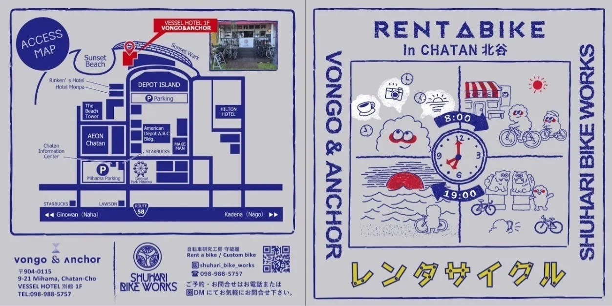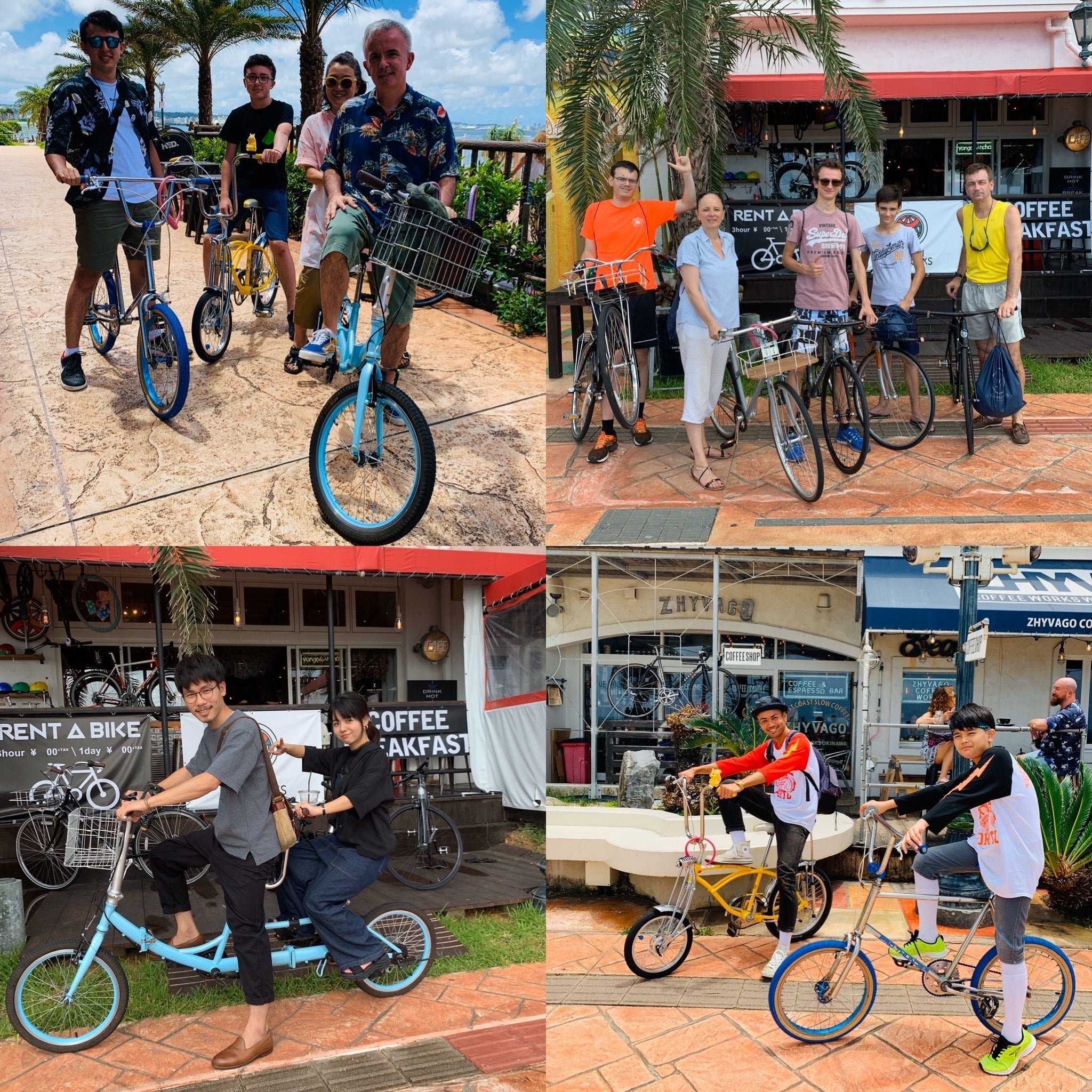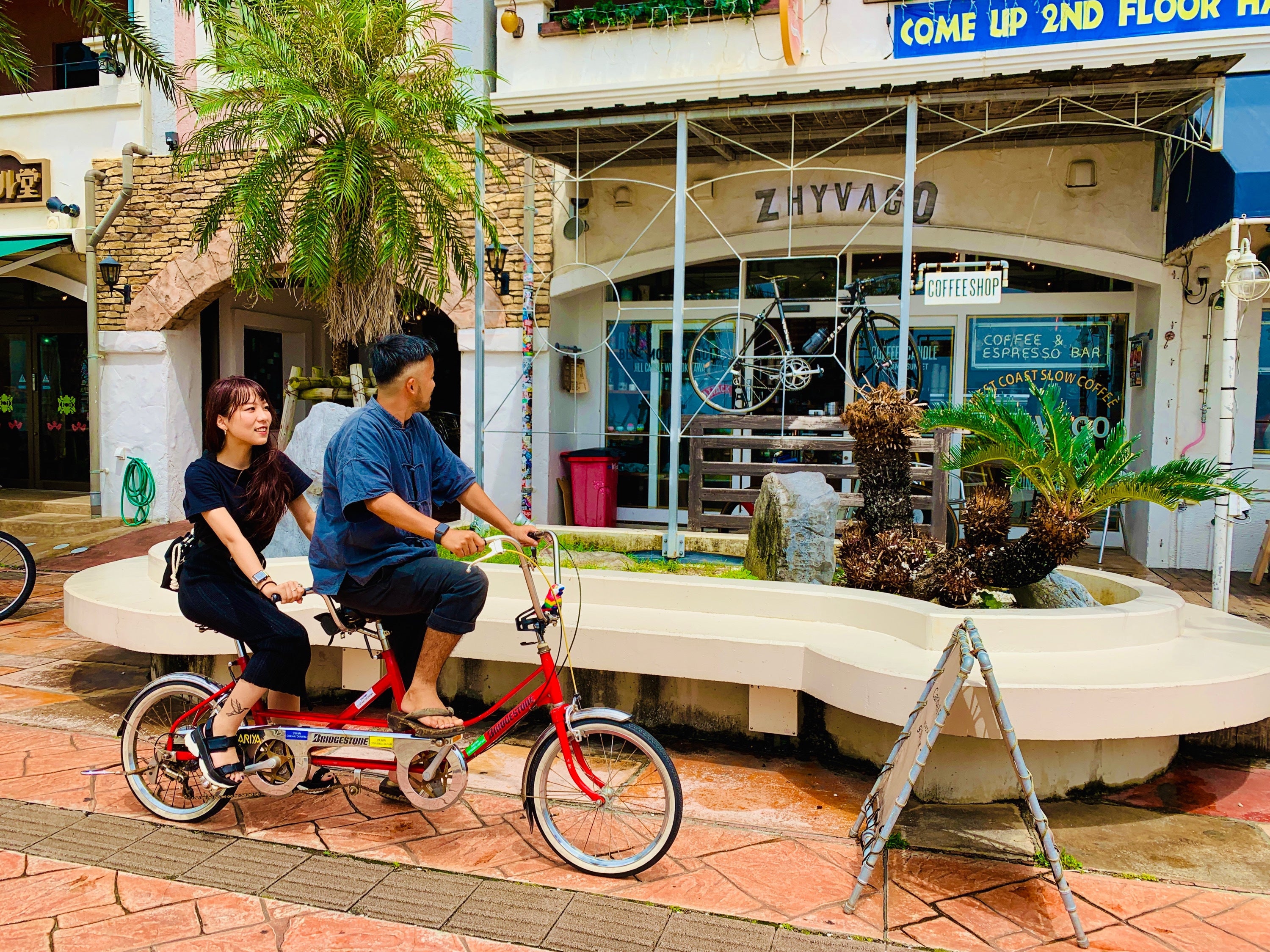 僕は、昨年2019年の4月に大阪から沖縄北谷町に移住し、8月より北谷町(ちゃたん)美浜のカフェVongo&Anchorを間借りして小さなレンタサイクル兼カスタム自転車ショップを始めました。レンタサイクルは普通の自転車を貸し出すのではなく2人乗り自転車(タンデムバイク)や豆自転車(とても小さな自転車)、トールバイク(自転車が縦に2段になった自転車)など目で見て楽しい乗って楽しいを軸に観光や思い出作りの一つを担えるような彩り豊かな自転車を揃えていました。